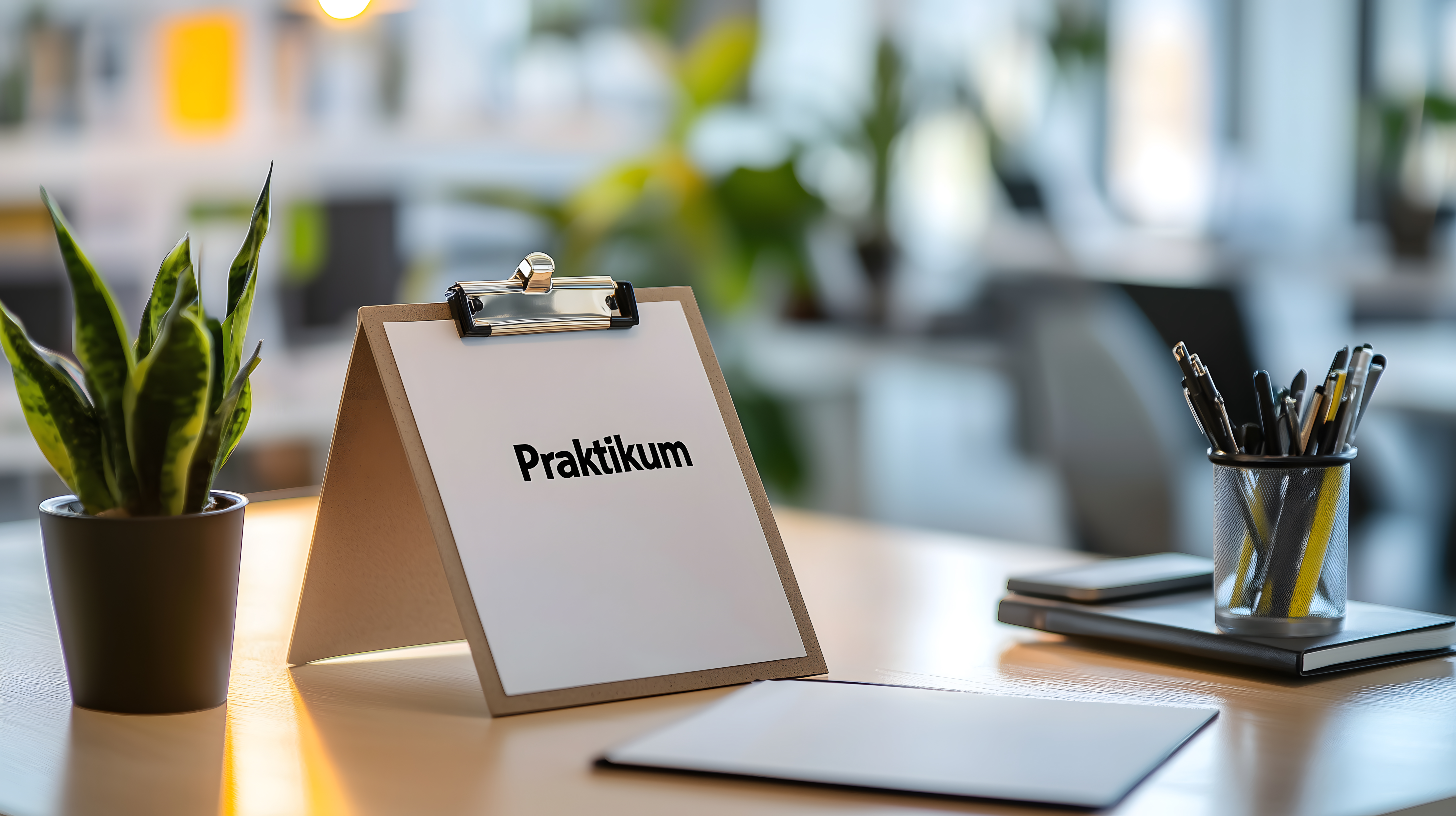 Dieses Foto zeigt ein minimalistisches, modernes Büroumfeld. Der Fokus liegt auf einem Praktikum-Schild, der auf einem Schreibtisch aufgestellt ist. Neben dem Schild befinden sich weitere Büroaccessoires wie Stifte, Notizblöcke und eine grüne Zimmerpflanze. Der Hintergrund ist unscharf, lässt aber einen hellen, sonnigen Raum mit großen Fenstern erkennen. Das Bild vermittelt einen aufgeräumten, professionellen Arbeitsplatz, der für verschiedene Anwendungen wie Blog-Artikel, Newsletter-Gestaltung oder Werbekampagnen geeignet wäre. Als kostenloses Stockfoto in hoher Auflösung unter Creative-Commons-Lizenz kann es vielfältig eingesetzt werden.