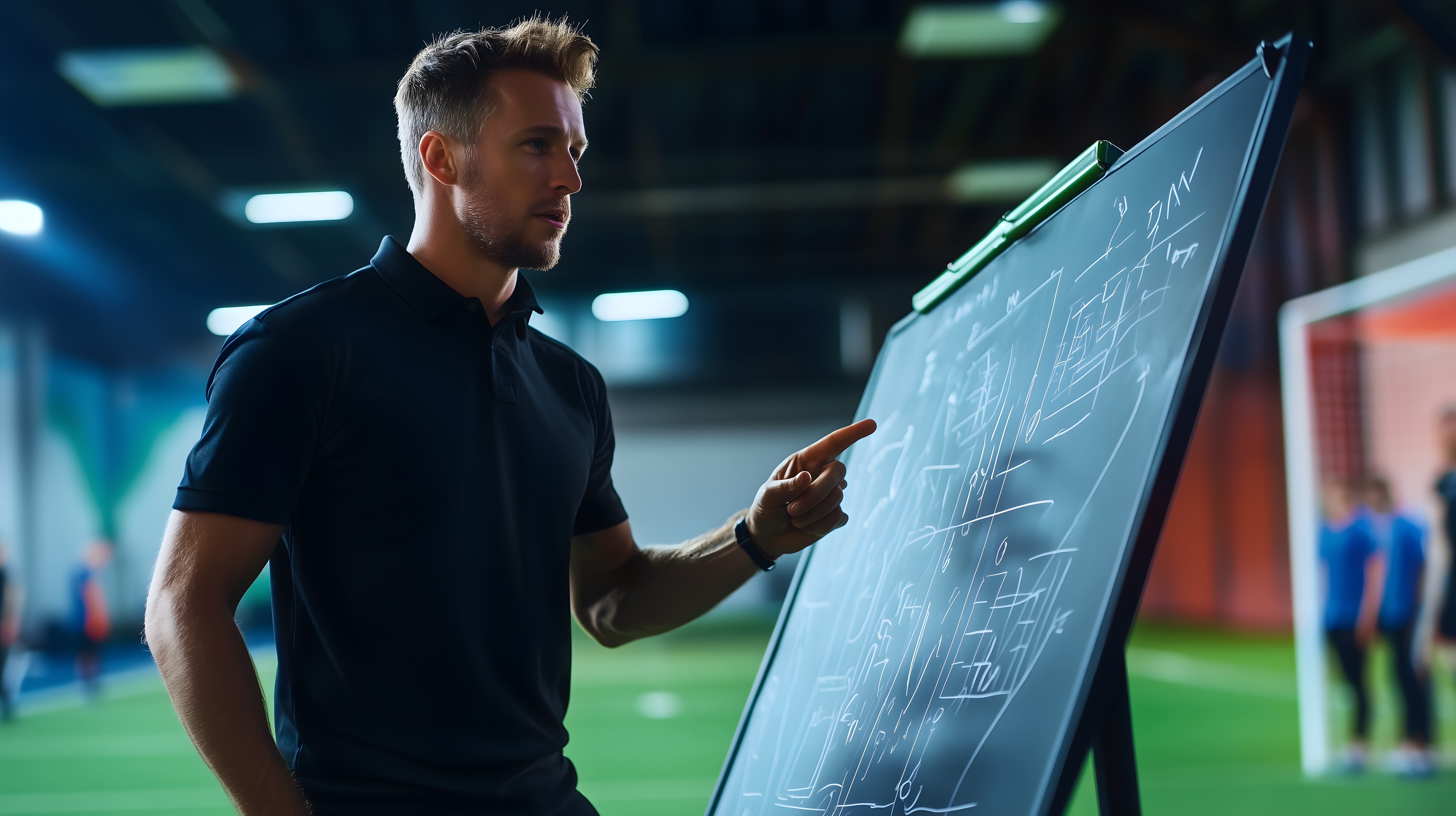 Das Foto zeigt einen Sporttrainer, der an einer interaktiven digitalen Tafel eine Spielstrategie präsentiert und erklärt. Der Trainer, der eine schwarze Poloshirt trägt, steht vor einer großen Projektionsfläche, auf der ein Spielfeld mit Bewegungsverläufen und Positionen der Spieler dargestellt ist. Mit einem Zeigegerät deutet er auf die Taktikgrafik und erläutert offensichtlich eine Spielzugplanung für sein Team. Das Foto eignet sich hervorragend für Präsentationen und Berichte rund um Sporttraining, Teamführung, Coaching, Fortbildungen und Bildungsthemen. Als kostenloses Stockfoto in hoher Auflösung unter der Creative-Commons-Lizenz kann es vielseitig in Blogs, Social-Media-Beiträgen oder Werbekampagnen eingesetzt werden.