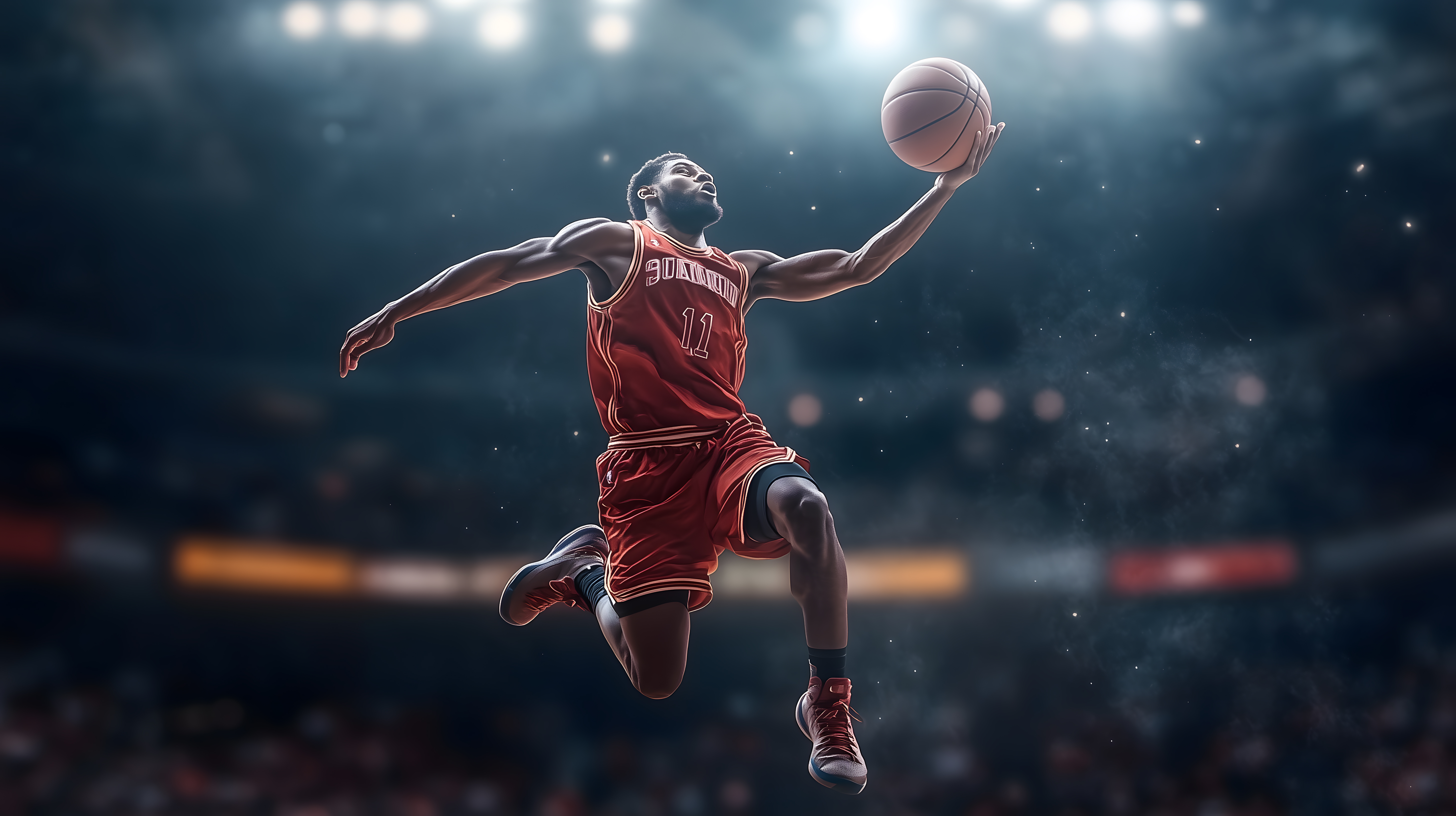 Das Bild zeigt einen dynamischen Basketballspieler in Aktion. Der Spieler in einer roten Uniform springt durch die Luft, während er den Basketball in den Händen hält. Im Hintergrund ist eine dunkle Halle zu sehen, die von Scheinwerfern beleuchtet wird, was dem Bild eine dramatische Atmosphäre verleiht. Die Szene vermittelt den Eindruck von Kraft, Geschwindigkeit und Präzision, die für den Basketballsport typisch sind.