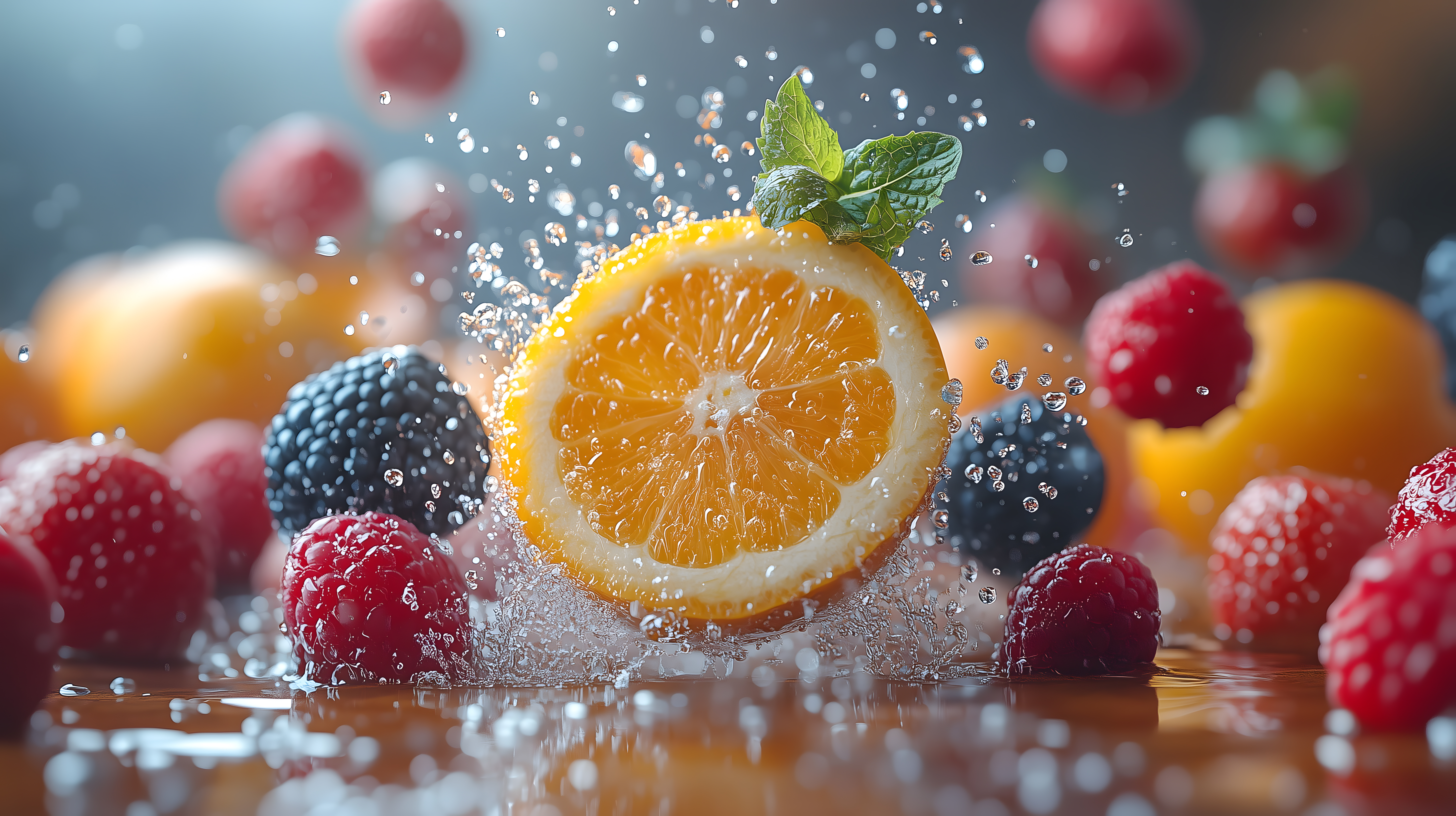 Dieses farbenfrohe Foto zeigt eine Nahaufnahme einer halbgeschnittenen Zitronenscheibe, die von Wassertropfen umgeben ist. Die Zitronenscheibe ist vor einem unscharfen, natürlichen Hintergrund mit weiteren Früchten wie Himbeeren, Brombeeren und Pfirsichen platziert. Die Komposition legt den Fokus auf die detailreiche Struktur und Beschaffenheit der Zitronenscheibe, die vom Wasser umspielt wird und so eine lebendige, erfrischende Stimmung vermittelt. Dieses hochauflösende Stockfoto eignet sich hervorragend für den Einsatz in Blogs, Newslettern, Social-Media-Beiträgen oder Werbematerialien, die ein Gefühl von Frische, Gesundheit und Sommer vermitteln möchten. Es steht unter der Creative-Commons-Lizenz zur kostenlosen Nutzung zur Verfügung.