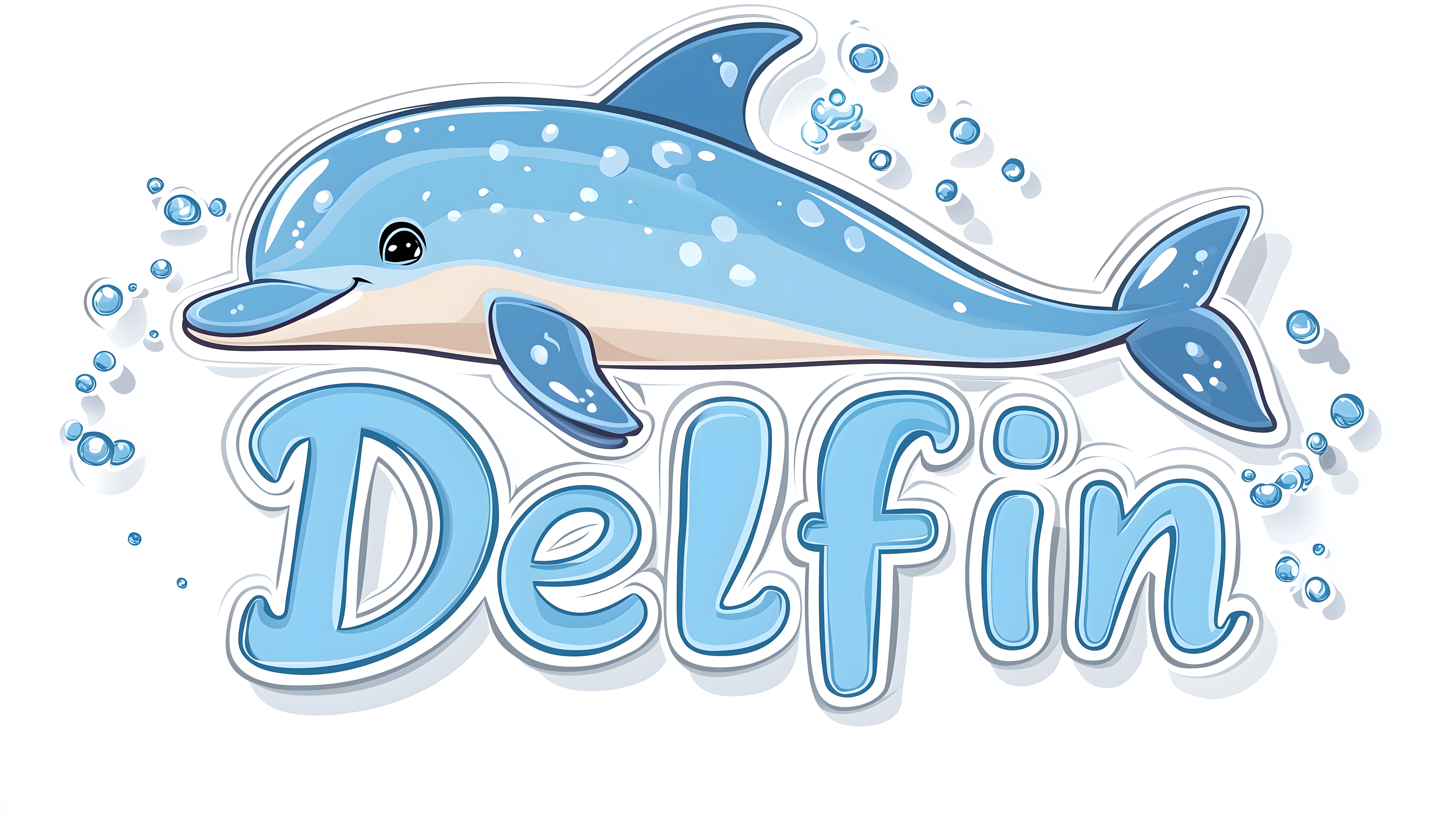 Das Bild zeigt einen niedlichen, blau-weißen Delfin, der fröhlich im Wasser schwimmt und von Wasserblasen umgeben ist. Der Delfin hat große, freundliche Augen und einen lächelnden Gesichtsausdruck, der eine spielerische und fröhliche Stimmung vermittelt. Die Illustration ist in klaren Blautönen gehalten und hat einen cartoonartigen, liebevollen Stil, der sich gut für die Verwendung in Kinderbüchern, Postern oder auf Social-Media-Kanälen eignet.