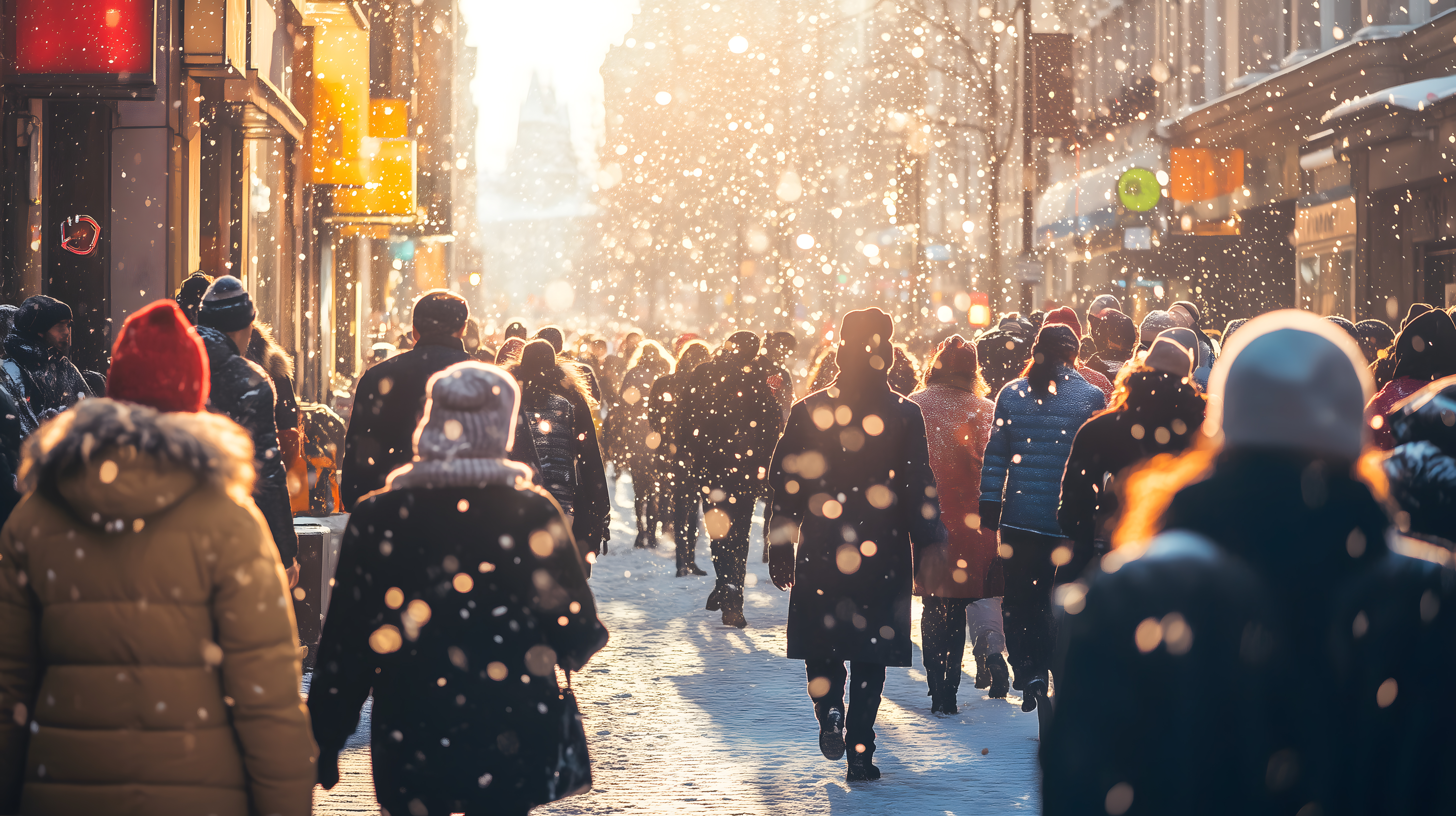 Dieses Foto zeigt eine verschneite Einkaufsstraße in einer Großstadt. Viele Menschen in Winterjacken und Mützen strömen durch die Gassen, umgeben von festlicher Beleuchtung und geschmückten Schaufenstern. Der Schneefall verleiht der Szene eine romantische, fast märchenhafte Stimmung. Das Bild ist ideal als kostenloses Stockfoto für Weihnachts- und Winterkampagnen, Blogbeiträge oder Werbematerialien in hoher Auflösung und unter Creative-Commons-Lizenz verfügbar.