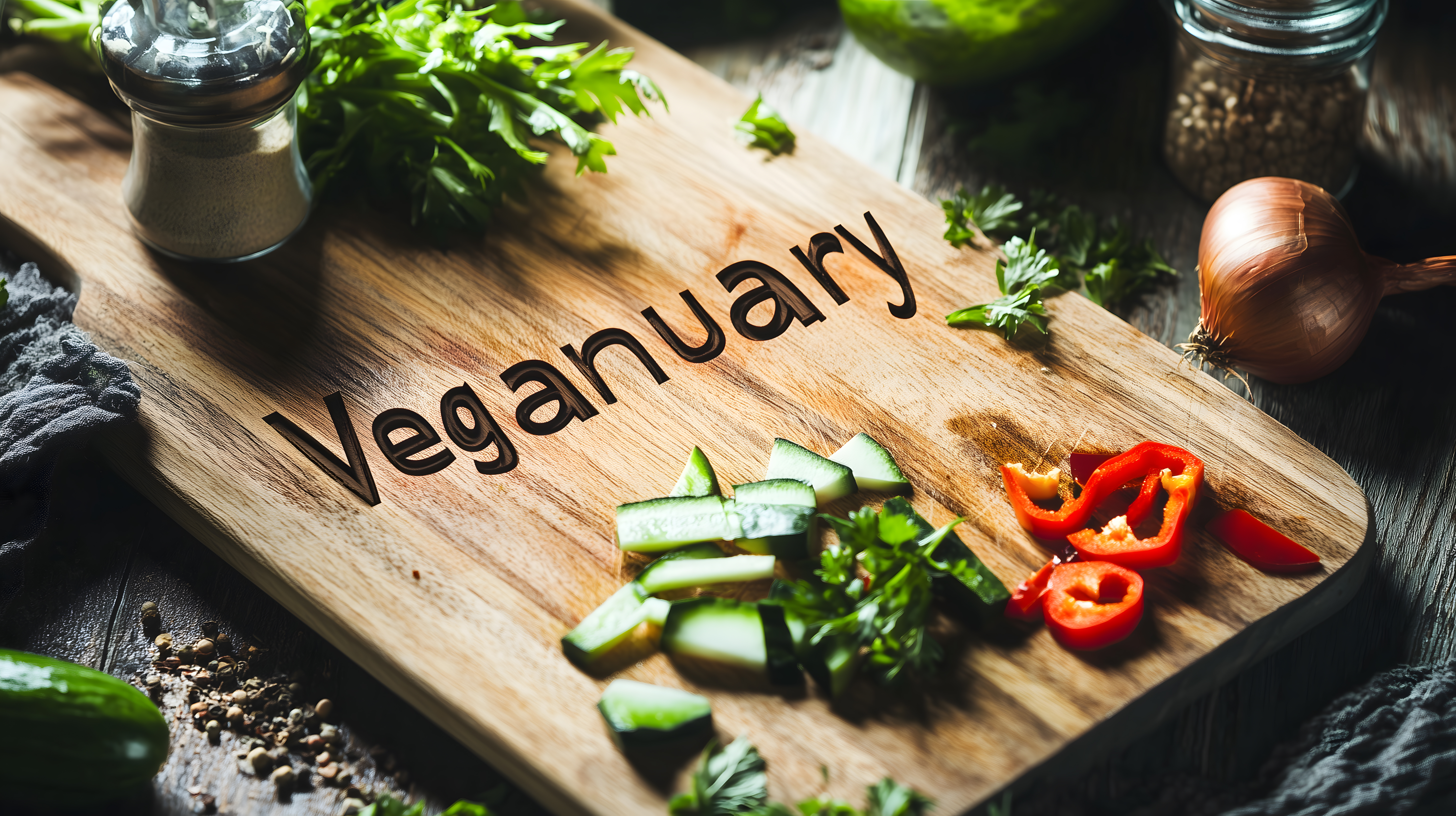 Dieses Foto zeigt eine rustikale Szene mit einem Holzbrett, auf dem verschiedene frische Gemüsesorten wie Gurke, Paprika und Petersilie arrangiert sind. Der Schriftzug 'Veganuary' auf dem Holzbrett weist darauf hin, dass das Bild für eine vegane Kampagne oder Rezeptsammlung verwendet werden kann. Die Komposition ist natürlich und organisch, mit einer Mischung aus grünen und roten Farbtönen, die den gesunden, natürlichen Charakter des Sujets unterstreichen. Dieses hochwertige Stockfoto eignet sich hervorragend für den Einsatz in Blogs, Newslettern, Social-Media-Beiträgen oder Werbematerialien zum Thema Veganismus, gesunde Ernährung oder Nachhaltigkeit. Es ist in hoher Auflösung verfügbar und unter einer Creative-Commons-Lizenz lizenziert.