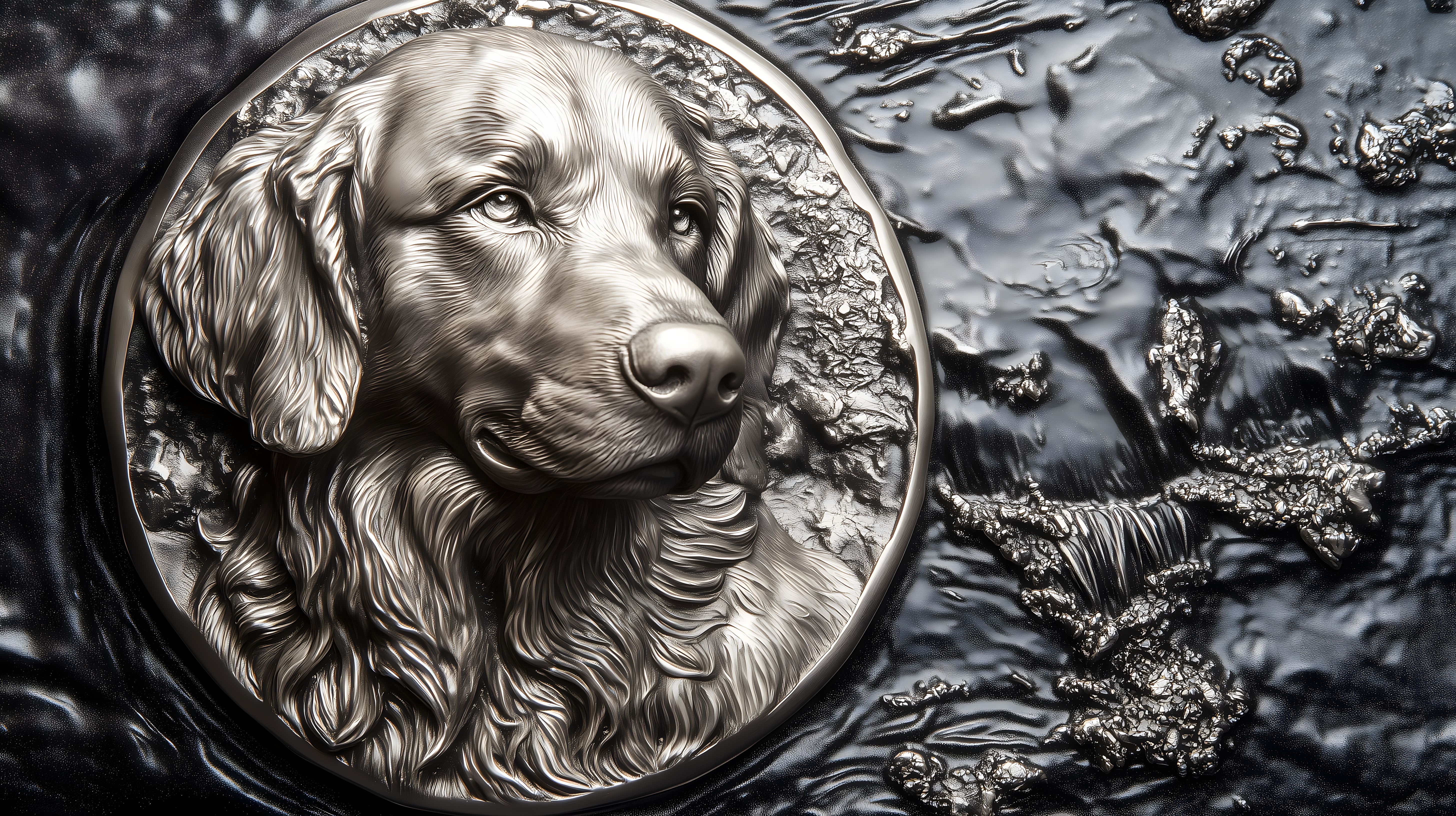 Dieses faszinierende Foto zeigt eine fotorealistische Darstellung eines Golden Retriever-Hundes in Form eines kunstvollen Basreliefs. Die detailreiche Abbildung des Kopfes mit seinen weichen Fellstrukturen und ausdrucksstarken Augen verleiht dem Motiv eine beeindruckende Tiefe und Lebendigkeit. Die Schwarz-Weiß-Ausführung unterstreicht den skulpturalen Charakter des Kunstwerks und erzeugt eine stimmungsvolle, ästhetische Atmosphäre.