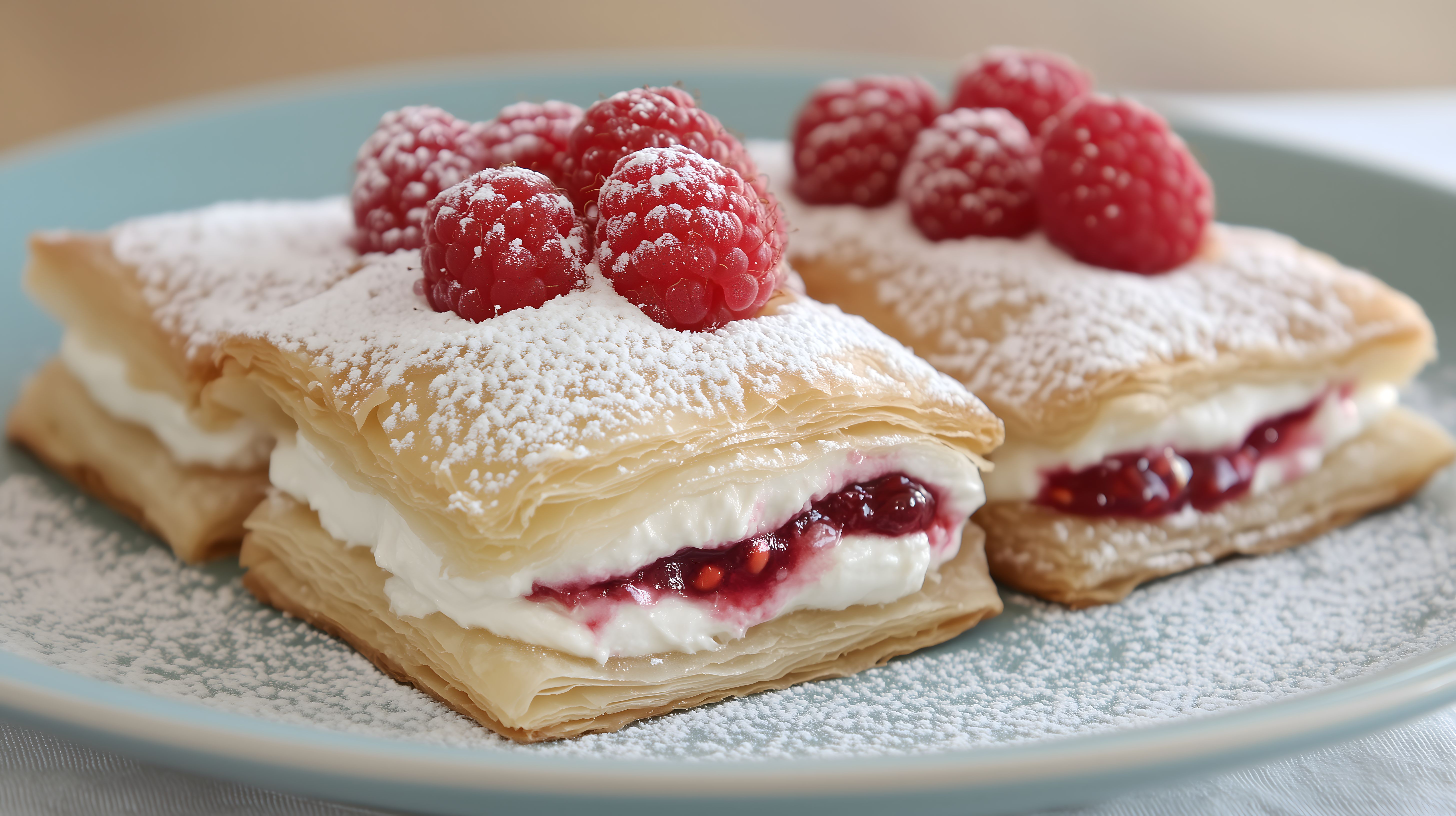 Das Foto zeigt einen leckeren Himbeer-Blätterteig-Dessert auf einem hellgrünen Teller. Der Blätterteig ist mit einer cremigen Füllung und frischen, roten Himbeeren belegt, die mit Puderzucker bestäubt sind. Die Anordnung der Zutaten und die warmen Farbtöne verleihen dem Gericht eine appetitliche und einladende Optik. Dieses hochauflösende Stockfoto eignet sich ideal für Beiträge in Blogs, Social-Media-Kanälen oder Werbekampagnen rund um das Thema Backen, Desserts und Genuss. Es ist unter einer Creative-Commons-Lizenz kostenlos verfügbar.