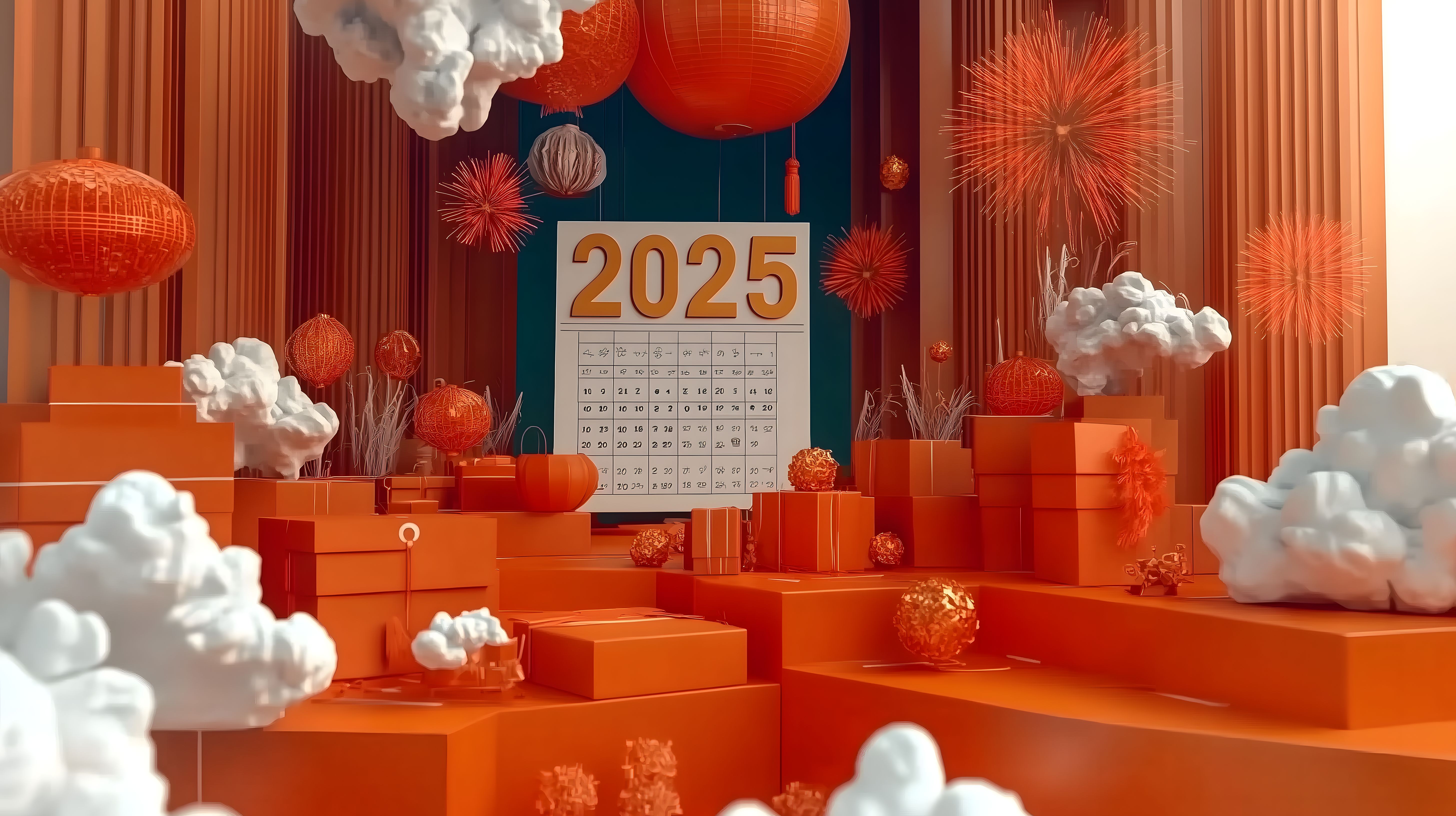 Dieses hochauflösende Stockfoto zeigt eine farbenprächtige, traditionelle chinesische Neujahrsdekorationsszene für das Jahr 2025. Im Vordergrund ist ein großer Wandkalender mit der Jahreszahl 2025 zu sehen, umgeben von roten Laternen, Feuerwerken, Papierschnitten und anderen typischen Elementen der chinesischen Neujahrsfeierlichkeiten. Die Szene ist in einem warmen, orangefarbenen Farbton gehalten und vermittelt eine festliche, feierliche Stimmung. Dieses Foto eignet sich hervorragend für die Verwendung in Blogs, Newslettern, sozialen Medien oder Werbematerialien, die einen feierlichen, traditionellen asiatischen Kontext benötigen. Als kostenloses Stockfoto unter Creative-Commons-Lizenz ist es für eine Vielzahl von Zwecken einsetzbar.
