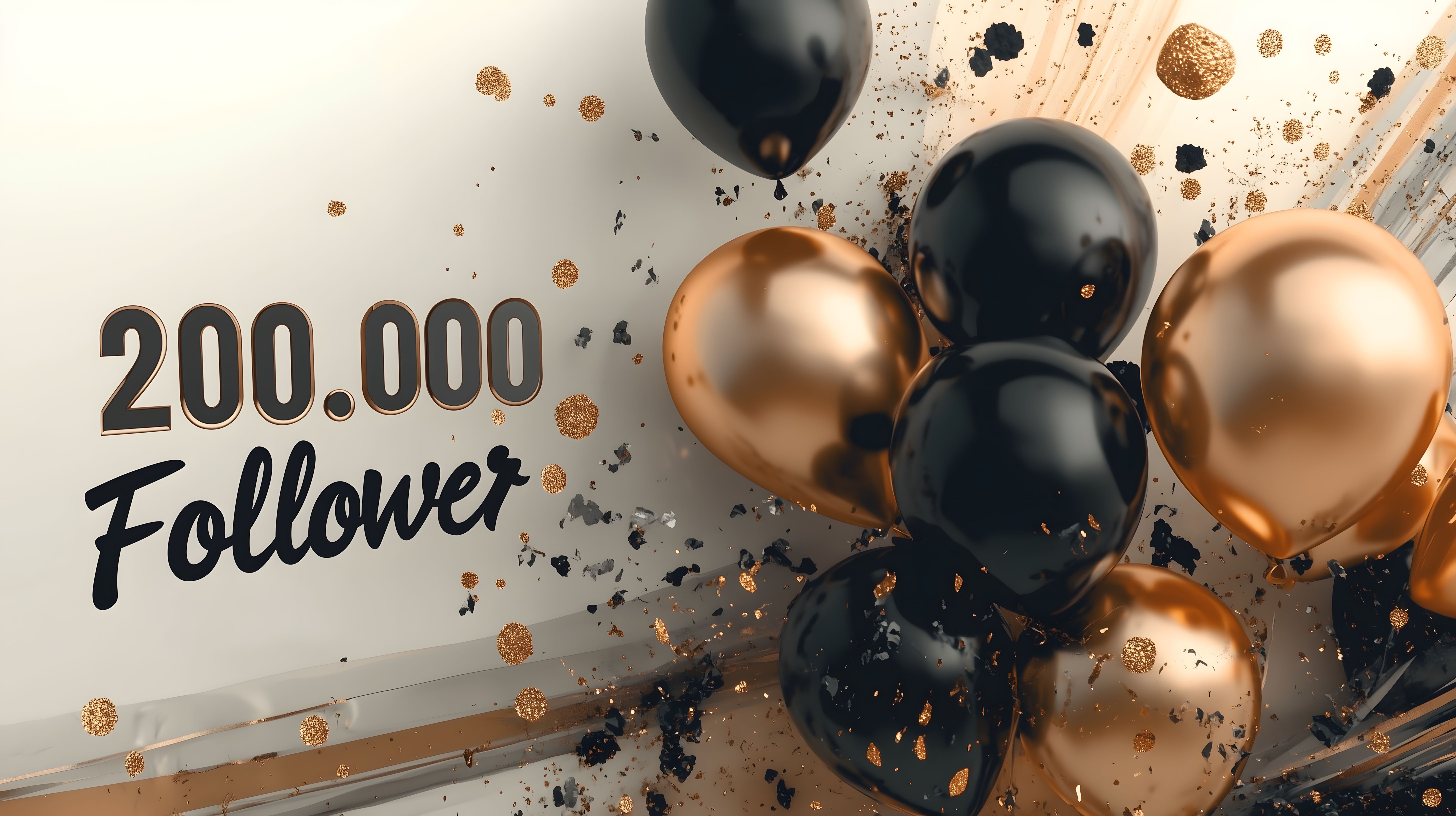 Dieses Foto zeigt eine festliche Dekoration zum Erreichen des 200.000 Follower-Meilensteins auf einer Plattform. Im Vordergrund sind große, schwarze und goldfarbene Luftballons zu sehen, die mit goldenen Konfetti-Teilchen übersät sind. Der Hintergrund ist weiß und trägt den prominenten Schriftzug '200.000 Follower'. Diese Aufnahme eignet sich hervorragend als Stockfoto für verschiedene Einsatzzwecke, wie Social-Media-Beiträge, Newsletter-Layouts, Werbeanzeigen oder Blog-Artikel zum Thema Social-Media-Marketing, Jubiläen und Erfolgsfeiern. Das hochauflösende Foto ist unter einer Creative-Commons-Lizenz verfügbar und kann kostenlos genutzt werden.