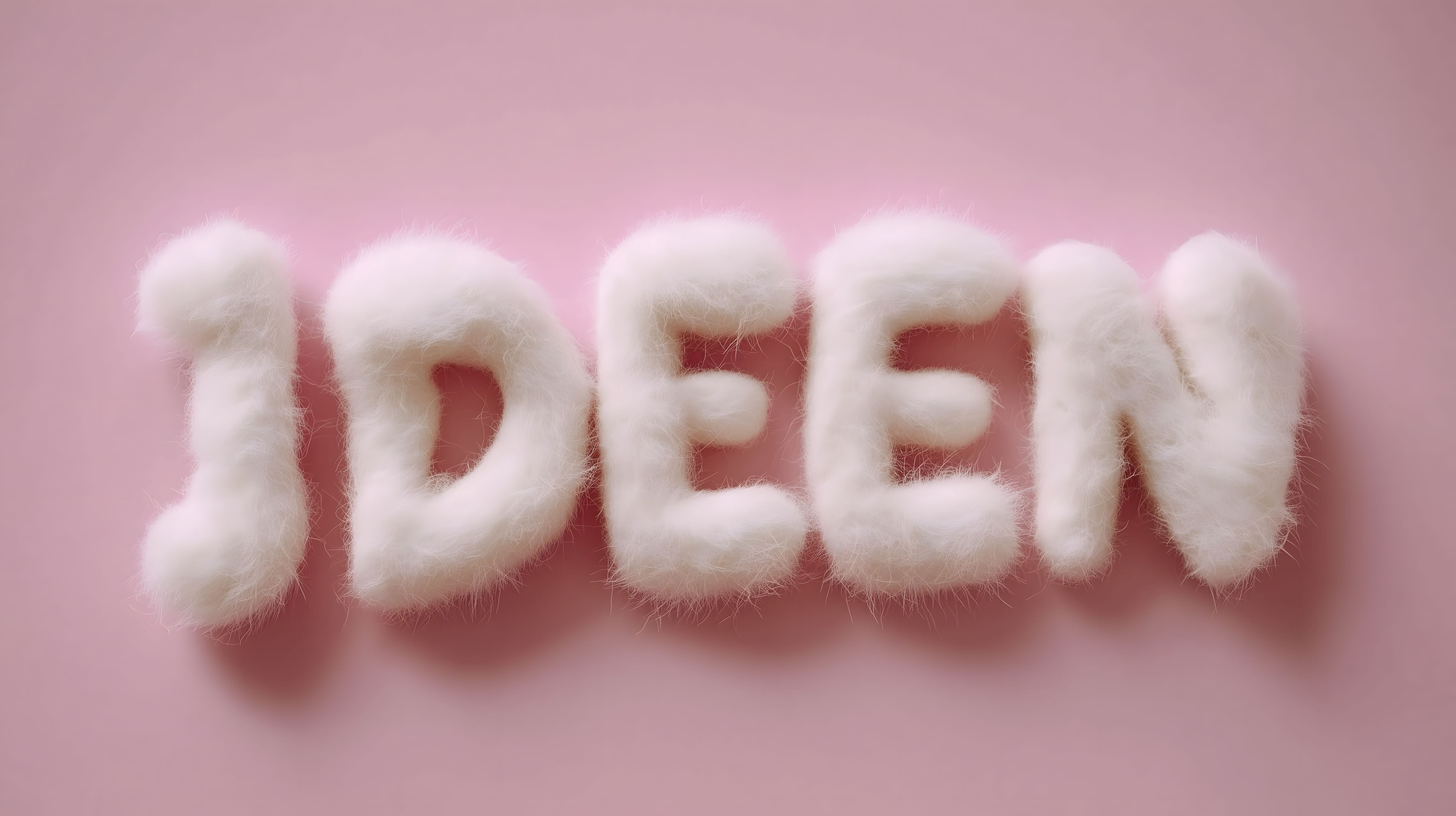 Das Bild zeigt einen rosa Hintergrund, auf dem sechs weiße, flauschige Buchstaben angeordnet sind, die das Wort 'IDEEN' ergeben. Die Buchstaben haben eine weiche, pelzige Textur, die einen einladenden und kreativen Eindruck vermittelt. Dieses Motiv eignet sich hervorragend als Gestaltungselement für Textdesigns, Grafikprojekte oder Werbemittel wie Poster, Social-Media-Posts oder Newsletter. Das hochauflösende Stockfoto ist kostenfrei unter einer Creative-Commons-Lizenz verfügbar und kann frei genutzt werden.