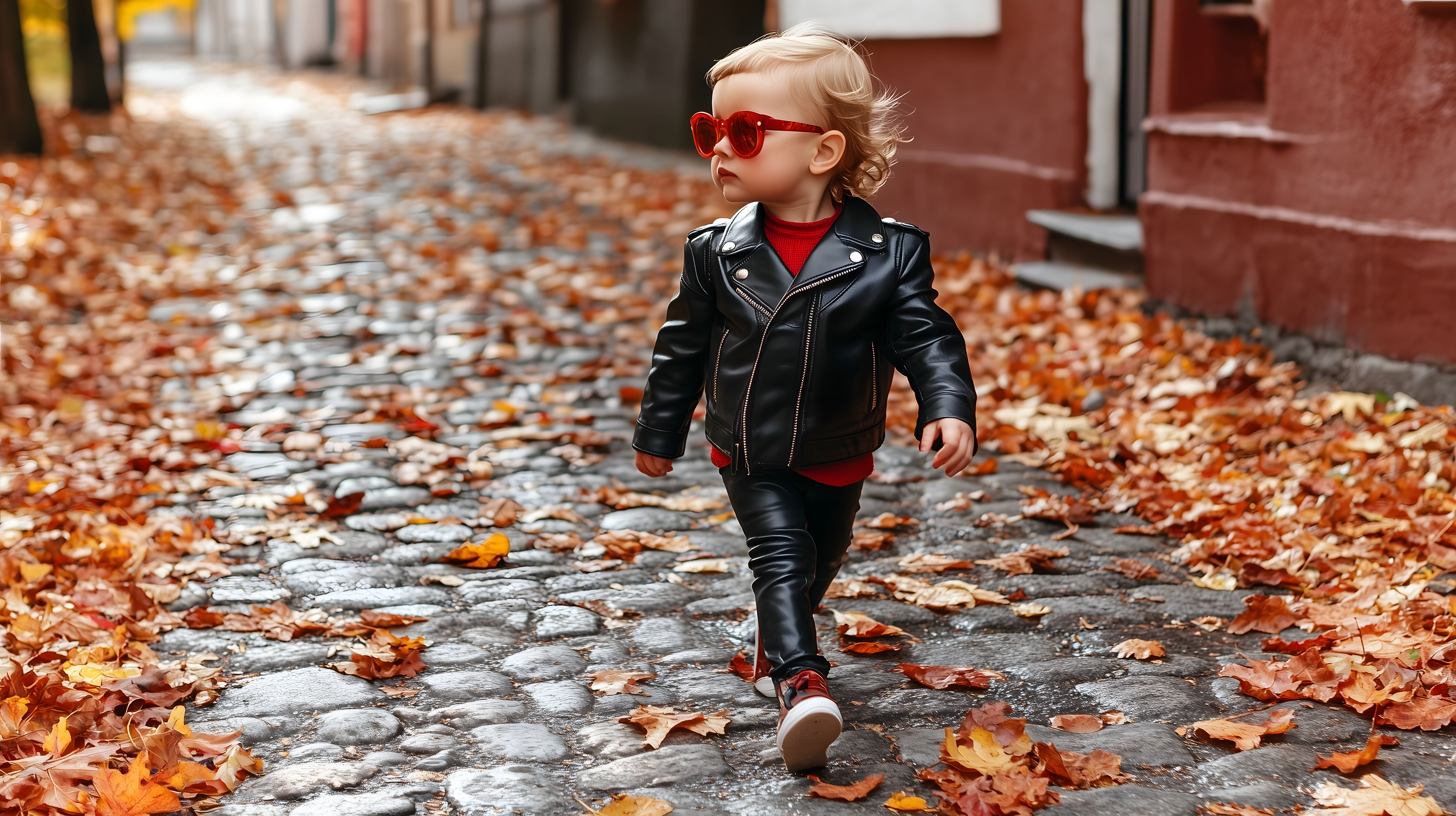 Dieses faszinierende Foto zeigt ein kleines blondes Mädchen, das in einer bunten Herbstlandschaft spaziert. Das Kind trägt eine schwarze Lederjacke und rote Sonnenbrille, was seinem Aussehen einen coolen, modernen Touch verleiht. Der Kontrast zwischen dem Grau des Kopfsteinpflasters, den orangefarbenen Laubblättern am Boden und den rötlichen Fassaden im Hintergrund sorgt für eine stimmungsvolle, herbstliche Atmosphäre. Das Bild strahlt Lebensfreude und Entdeckerlust aus und lässt Fantasien über mögliche Abenteuer des Mädchens entstehen. Als kostenloses Stockfoto in hoher Auflösung und unter einer Creative-Commons-Lizenz eignet es sich hervorragend für den Einsatz in Blogs, Newslettern, Social-Media-Beiträgen oder Werbekampagnen rund um Kindheit, Mode, Lifestyle und Herbststimmung.