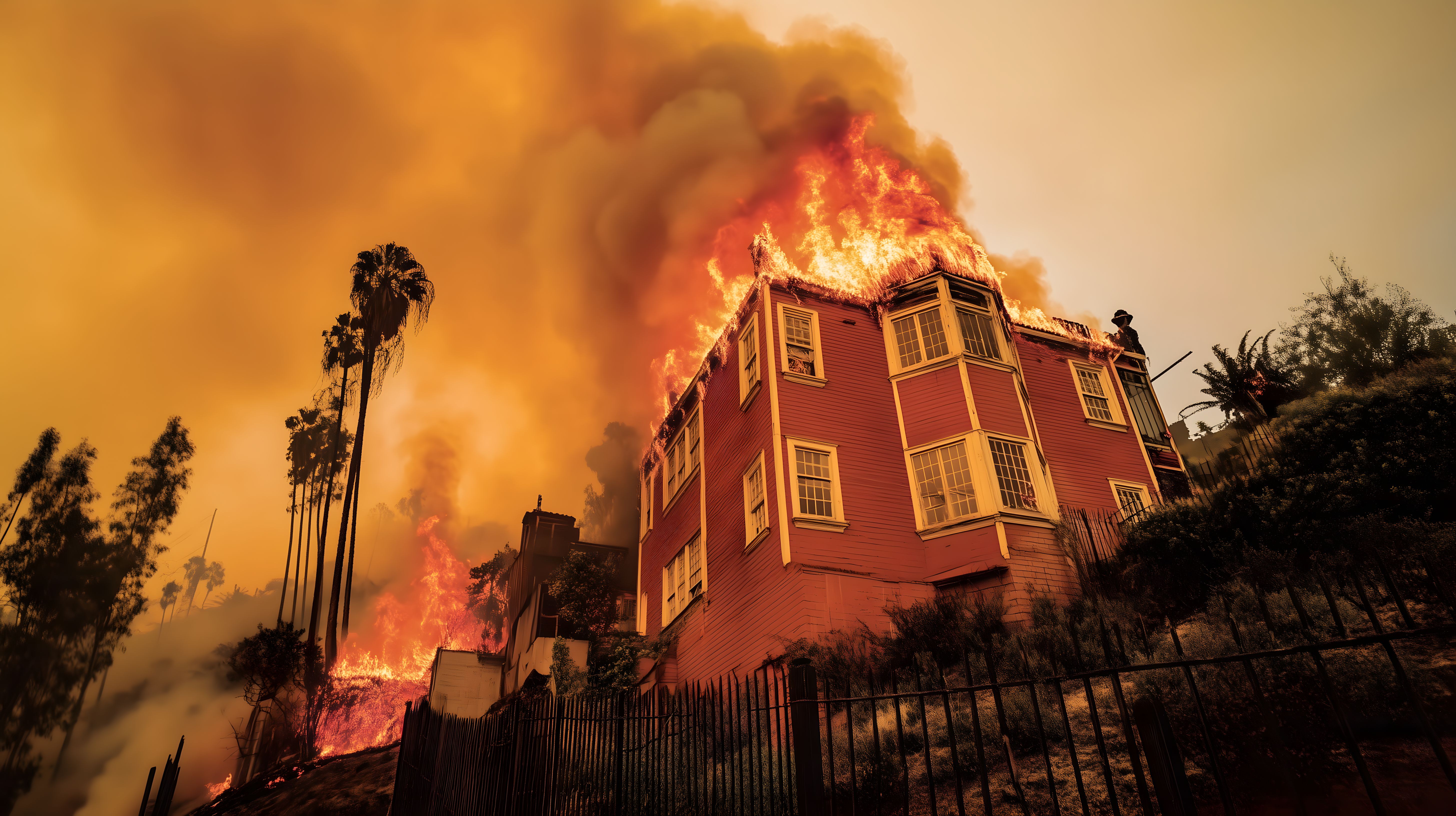 Dieses dramatische Foto zeigt ein heftiges Flammen-Inferno, das ein Gebäude in Los Angeles, Kalifornien, zu verschlingen droht. Die Flammen schlagen meterhoch aus den Fenstern und dem Dach, dunkle Rauchwolken verdunkeln den Himmel in einem warmen, orangeroten Farbton. Die Feuerwehr ist offenbar im Einsatz, um die Ausbreitung des Brandes zu verhindern. Dieses eindrucksvolle Foto eignet sich gut als kostenloses Stockfoto in hoher Auflösung unter Creative-Commons-Lizenz für Blogbeiträge, Newsletter, Social-Media-Inhalte oder Werbematerialien zum Thema Katastrophenmanagement, Brandschutz oder Krisenberichterstattung.