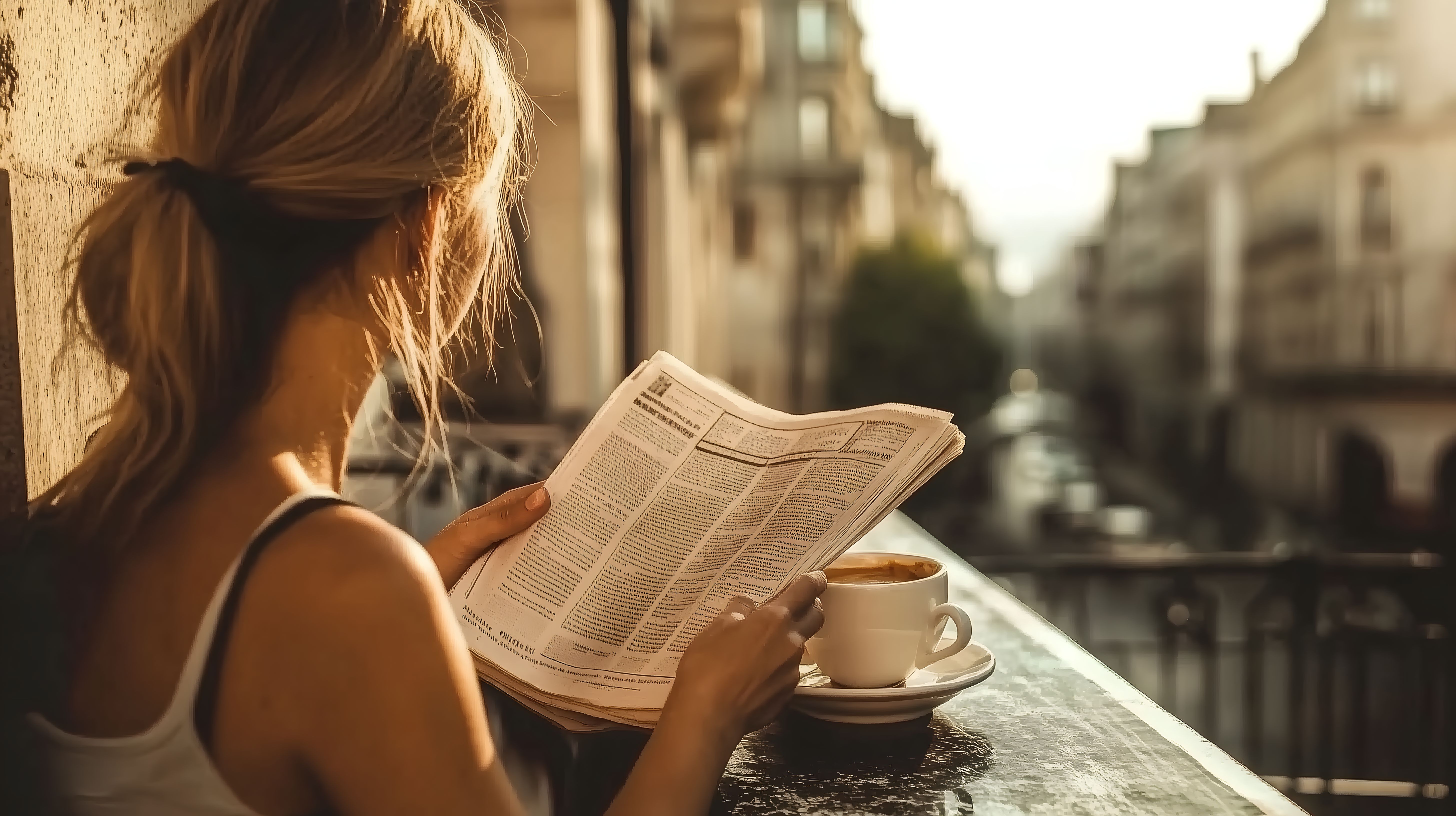 Das Foto zeigt eine Frau, die auf einem Balkon in einer Stadt gemütlich bei einer Tasse Kaffee Zeitung liest. Sie sitzt an einem Holztisch und hat den Blick auf die umliegenden Gebäude und Straßen gerichtet. Das warme Sonnenlicht taucht die Szene in ein angenehmes Licht und vermittelt eine Stimmung der Entspannung und Ruhe. Das Bild eignet sich hervorragend für die Verwendung in Blogbeiträgen, Newslettern oder Sozialen Medien, die das Thema Stadtleben, Morgenkaffee oder das Genießen von freier Zeit behandeln. Als kostenloses Stockfoto in hoher Auflösung und unter einer Creative-Commons-Lizenz verfügbar, lässt es sich vielseitig einsetzen.