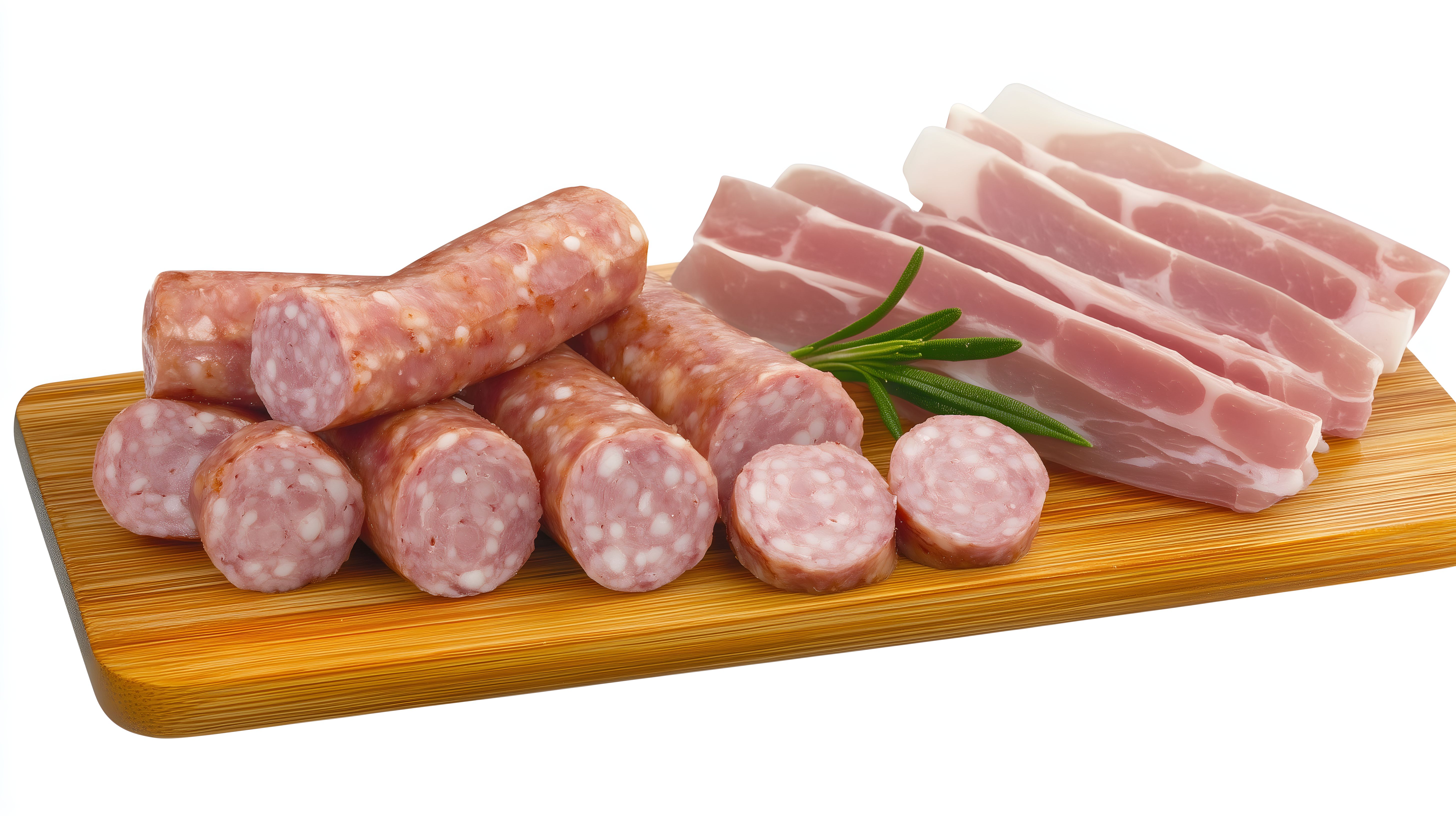 Diese Fotografie zeigt eine leckere Auswahl an hausgemachter Wurst und Speck, die auf einem hölzernen Schneidebrett angerichtet sind. In der Mitte befinden sich mehrere Scheiben einer dunkel geräucherten Salami, umgeben von würzigen Braten- und Räucherwürsten. An den Seiten sind saftige Speckscheiben zu sehen, die zusammen eine appetitliche Fleischplatte ergeben. Als dekorativer Akzent wurde ein Zweig Rosmarin auf dem Brett platziert. Das Bild vermittelt eine natürliche, rustikale Atmosphäre und eignet sich perfekt für Rezeptblog-Beiträge, Kochbücher, Catering-Websites oder Werbemittel im Gastronomie-Bereich. Dieses hochauflösende Stockfoto steht unter einer Creative Commons-Lizenz kostenlos zur Verwendung zur Verfügung.
