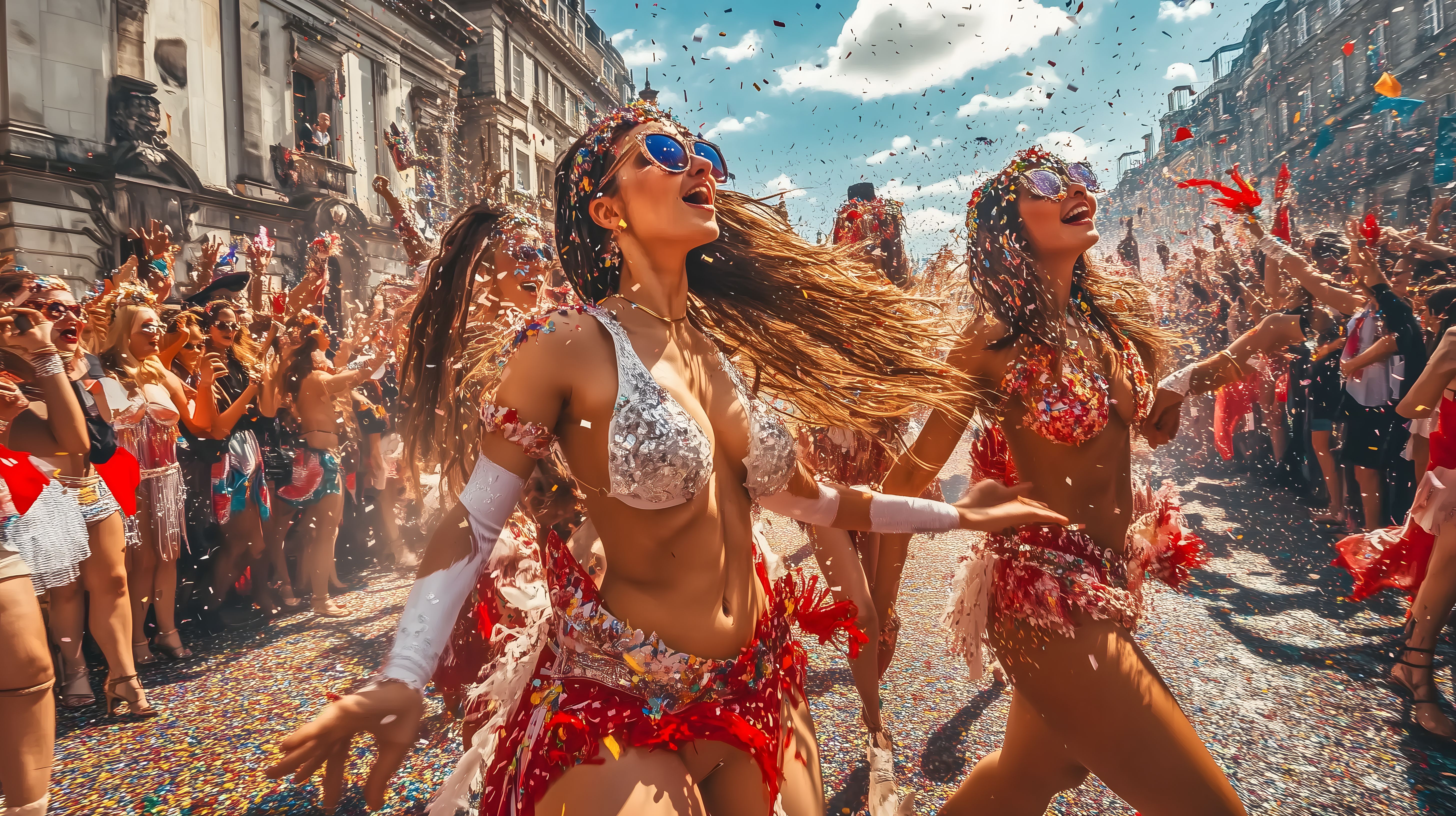 Dieses lebendige und farbenfrohe Foto zeigt eine ausgelassene Karnevalsfeier in einer belebten Stadt. Im Vordergrund tanzen zwei junge Frauen in prächtigen, mit Pailletten besetzten Kostümen und schwingen ihre langen, bunten Haare. Die Frauen scheinen ausgelassen und voller Energie zu sein, während sie mit schwungvollen Bewegungen durch die Menge tanzen. Im Hintergrund ist eine Menschenmenge zu sehen, die den Umzug mit Begeisterung verfolgt und Konfetti in die Luft wirft. Die Straßen sind geschmückt und bieten eine stimmungsvolle Atmosphäre für dieses traditionelle Fest. Dieses kostenlose Stockfoto in hoher Auflösung unter der Creative-Commons-Lizenz eignet sich hervorragend für den Einsatz in Blogs, Newslettern, Social-Media-Beiträgen oder Werbematerialien, um eine farbenfrohe, lebendige und feiertägliche Stimmung zu vermitteln.