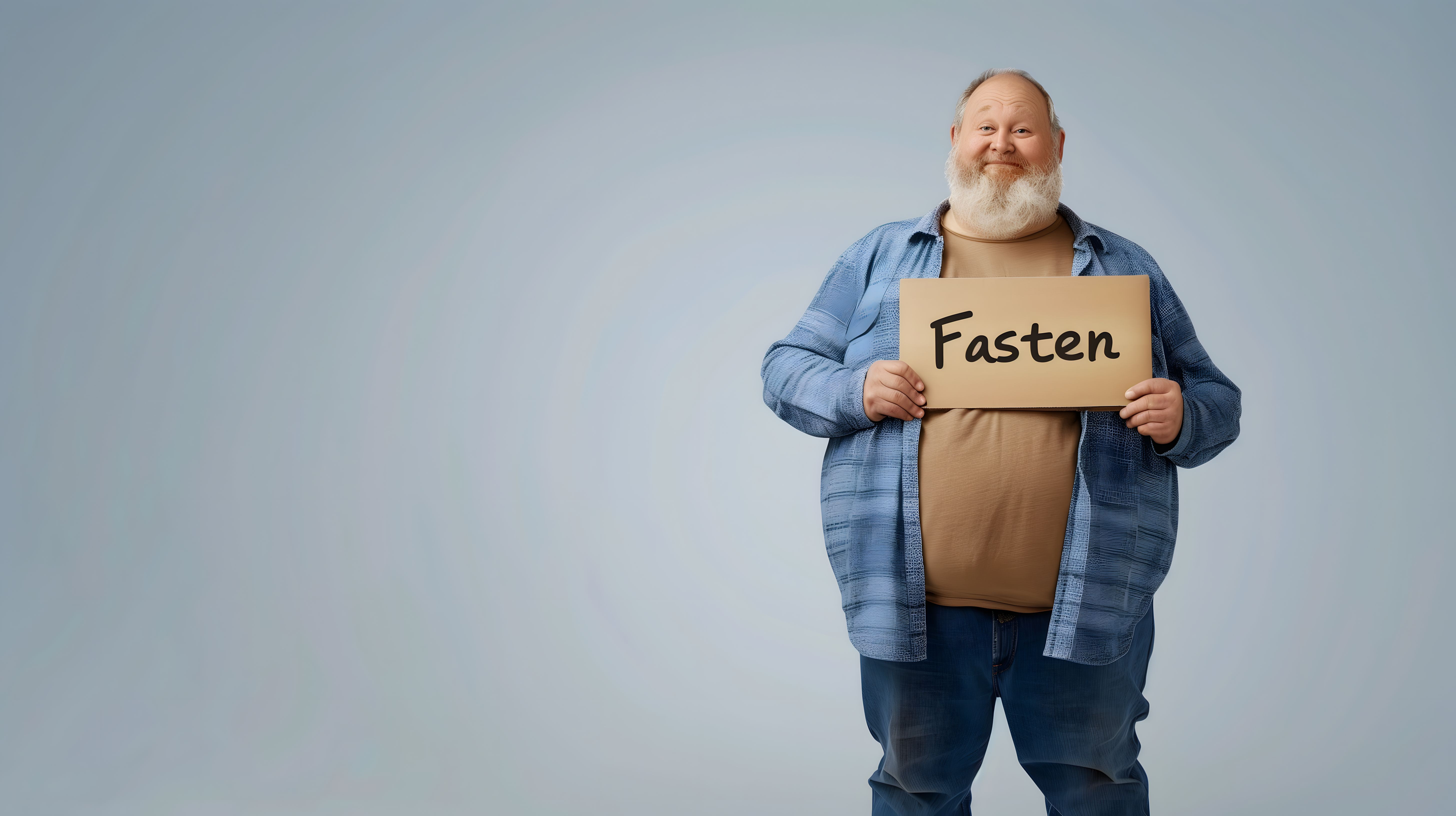 Das Bild zeigt einen älteren Mann mit einem langen Bart, der ein Pappschild mit der Aufschrift 'Fasten' vor einem neutralen, hellen Hintergrund hält. Der Mann trägt ein kariertes Hemd und sieht ernst in die Kamera. Das Foto könnte gut für Werbe- oder Blogbeiträge zum Thema Fasten, Ernährungsumstellung oder gesunder Lebensstil verwendet werden. Als hochauflösendes Stockfoto unter einer Creative-Commons-Lizenz ist es für vielfältige Zwecke in hoher Qualität verfügbar.