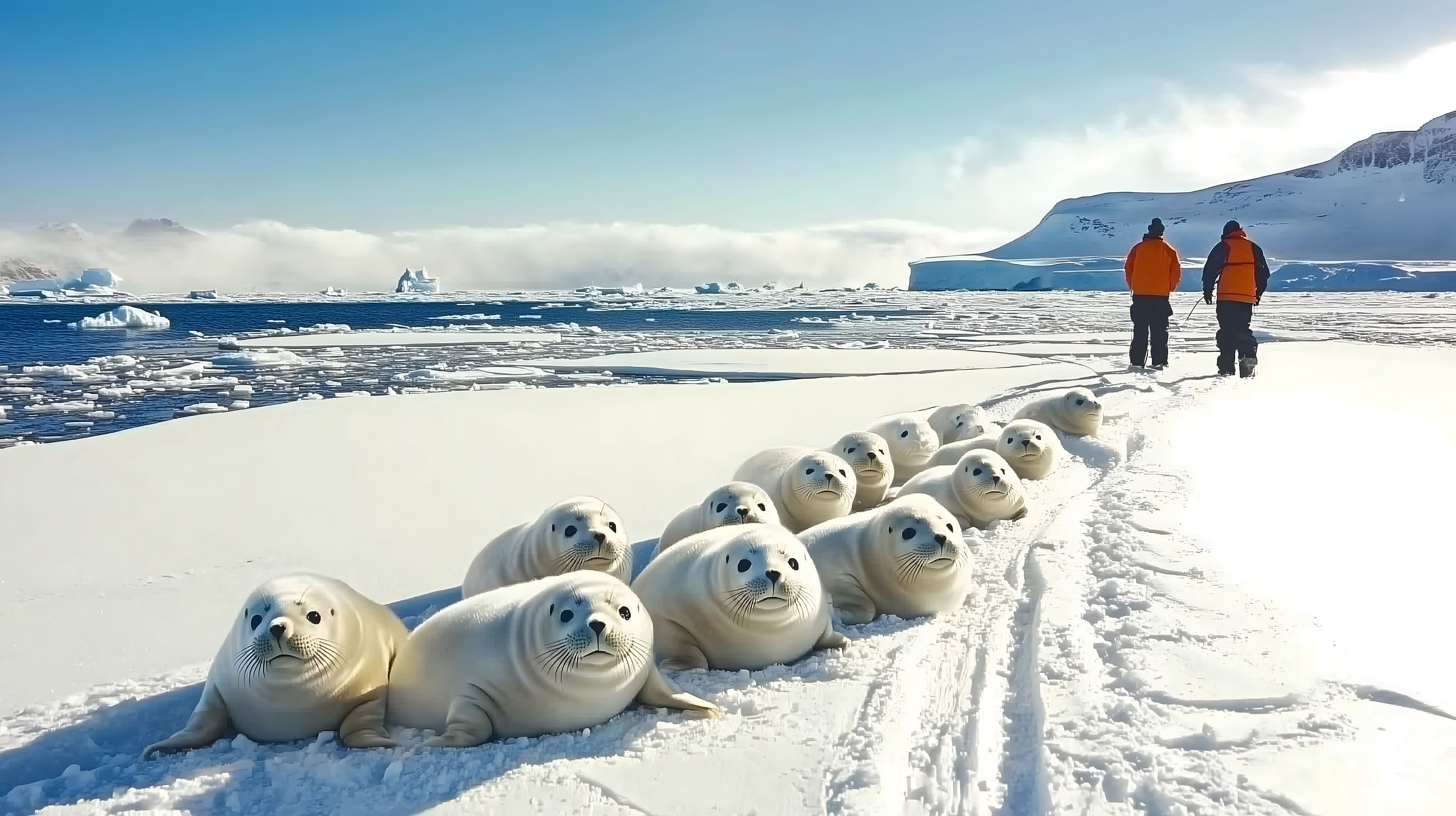 Das Bild zeigt eine Gruppe von Babyrobben, die auf einem schneebedeckten Eisfeld in der Arktis liegen. Die kleinen Robben sehen sehr niedlich aus mit ihren runden Körpern und neugierigen Blicken. Im Hintergrund sind weitere Eisberge und Schiffe zu sehen, was die arktische Umgebung dieser Szene unterstreicht. Dieses Stockfoto ist in hoher Auflösung und unter einer Creative-Commons-Lizenz verfügbar. Es eignet sich hervorragend für Beiträge in Blogs, Newslettern oder sozialen Medien, die sich mit Naturschutz, Tierwelt oder Reisen in die Arktis beschäftigen. Durch die kontrastreichen Farben und die Komposition der Szene ist es auch für werbliche Zwecke wie Anzeigen oder Broschüren gut geeignet.