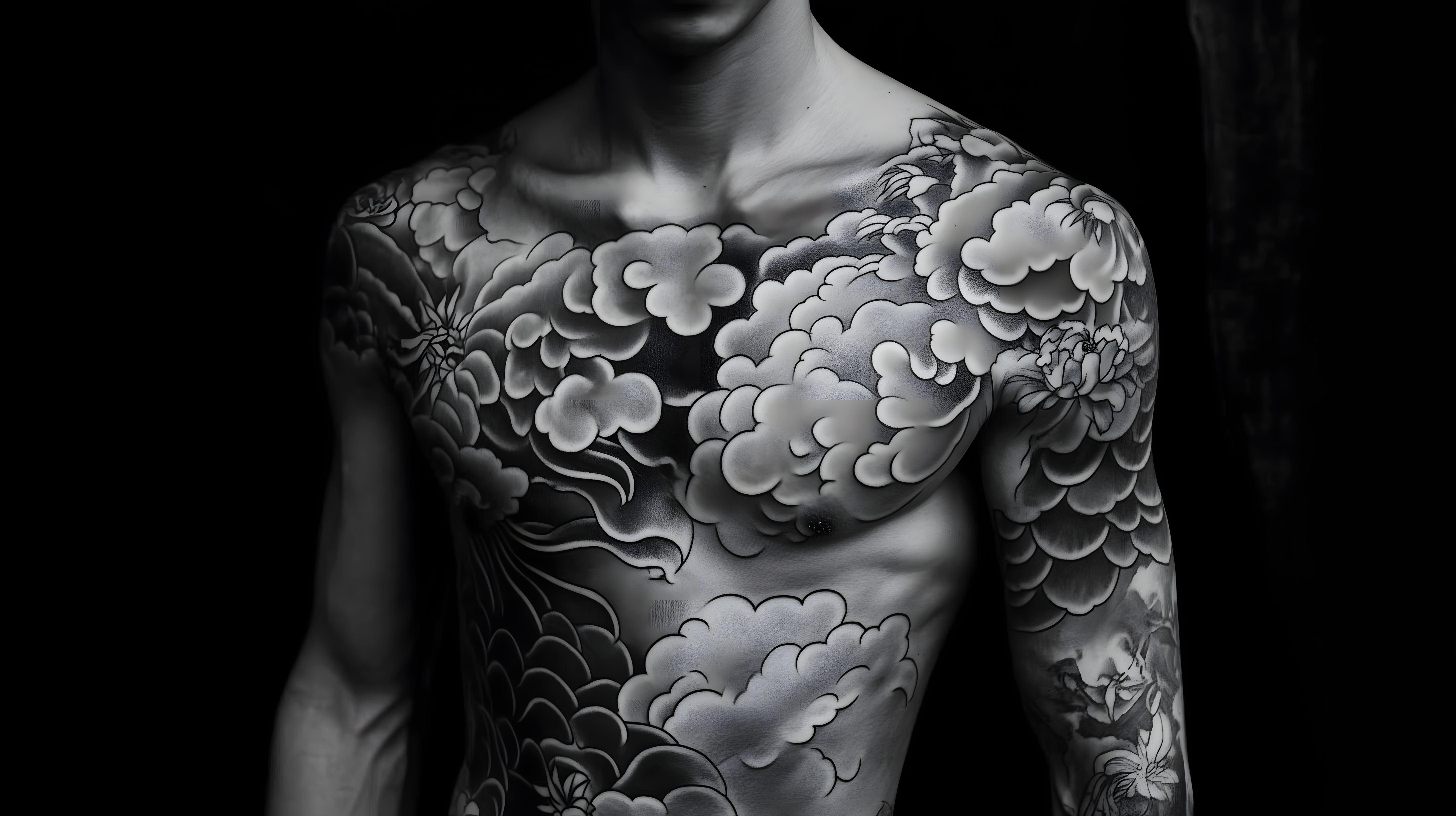 Das Foto zeigt einen männlichen Oberkörper mit einem detaillierten Blumentattoo in schwarz-weißer Ausführung. Die Tätowierung erstreckt sich über den gesamten Brustkorb und den Rücken des Mannes und zeigt eine realistische Darstellung von Blumen und Wolken. Das Tattoo zeichnet sich durch seine scharfe Konturierung, hohe Detailliertheit und plastische Wirkung aus, was einen beeindruckenden und kunstvollen Gesamteindruck vermittelt. Dieses hochwertige Stockfoto eignet sich hervorragend für Beiträge rund um Körperkunst, Tattoos, Lifestyle und Spiritualität. Es ist in hoher Auflösung verfügbar und kann unter einer Creative-Commons-Lizenz kostenfrei verwendet werden.