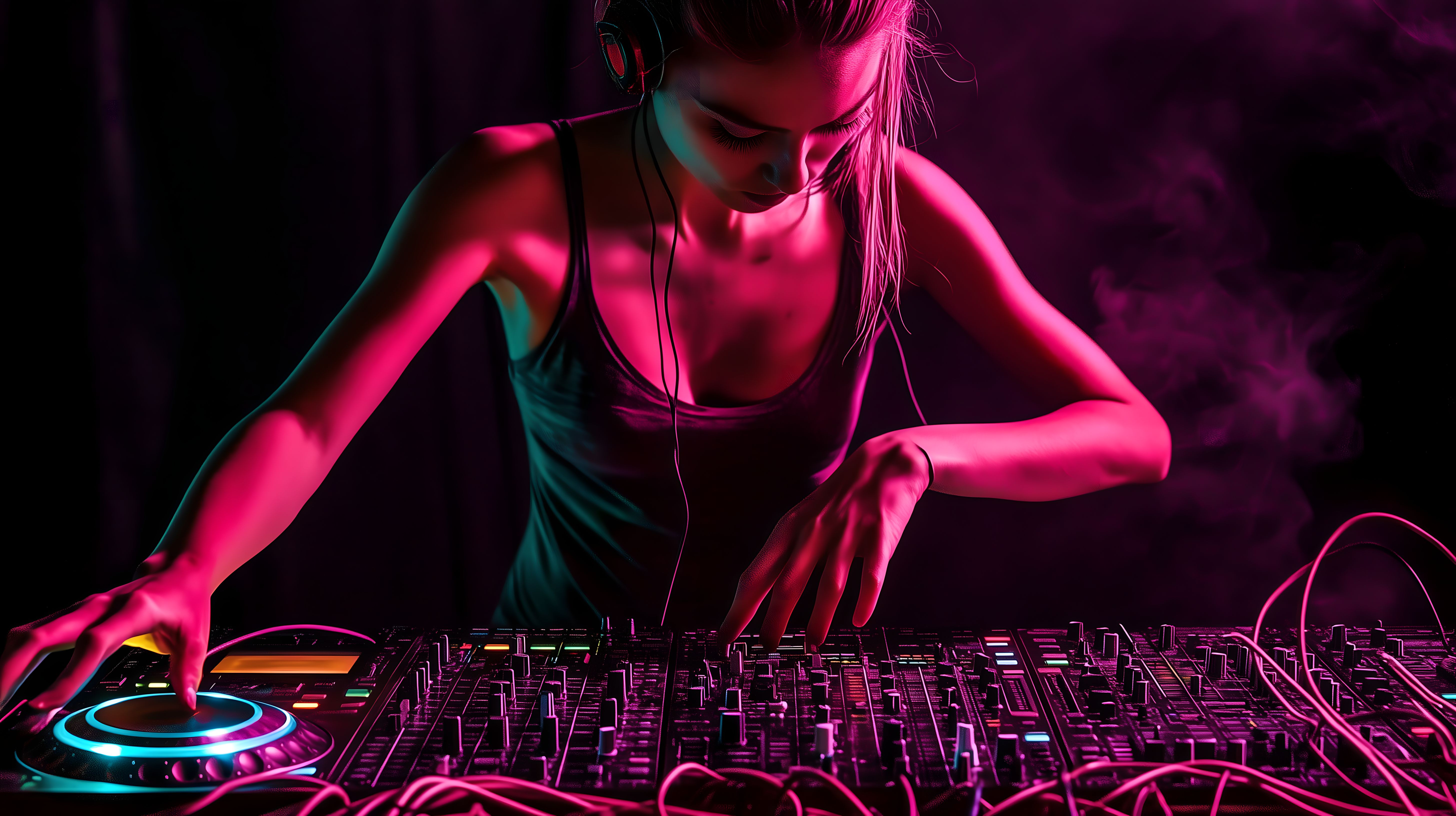 Das Bild zeigt eine Szene aus einem Nachtclub, wo eine DJ-Künstlerin konzentriert an einem Mischpult mixt und die Musik mit farbenfrohen Lichteffekten und Nebelschwaden verstärkt. Die Silhouette der Frau hebt sich vor dem dunklen Hintergrund ab, während ihre Arme in einer dynamischen Bewegung über die Regler schweben. Die Atmosphäre ist geprägt von intensiven, sinnlichen Farben wie Pink und Blau, die eine lebendige und energiegeladene Stimmung erzeugen. Dieses Stockfoto in hoher Auflösung eignet sich hervorragend für Blogbeiträge, Newsletter oder Social-Media-Posts rund um elektronische Musik, Nachtclubs und die Welt der DJ-Kultur. Es steht unter einer Creative-Commons-Lizenz zur Verfügung.