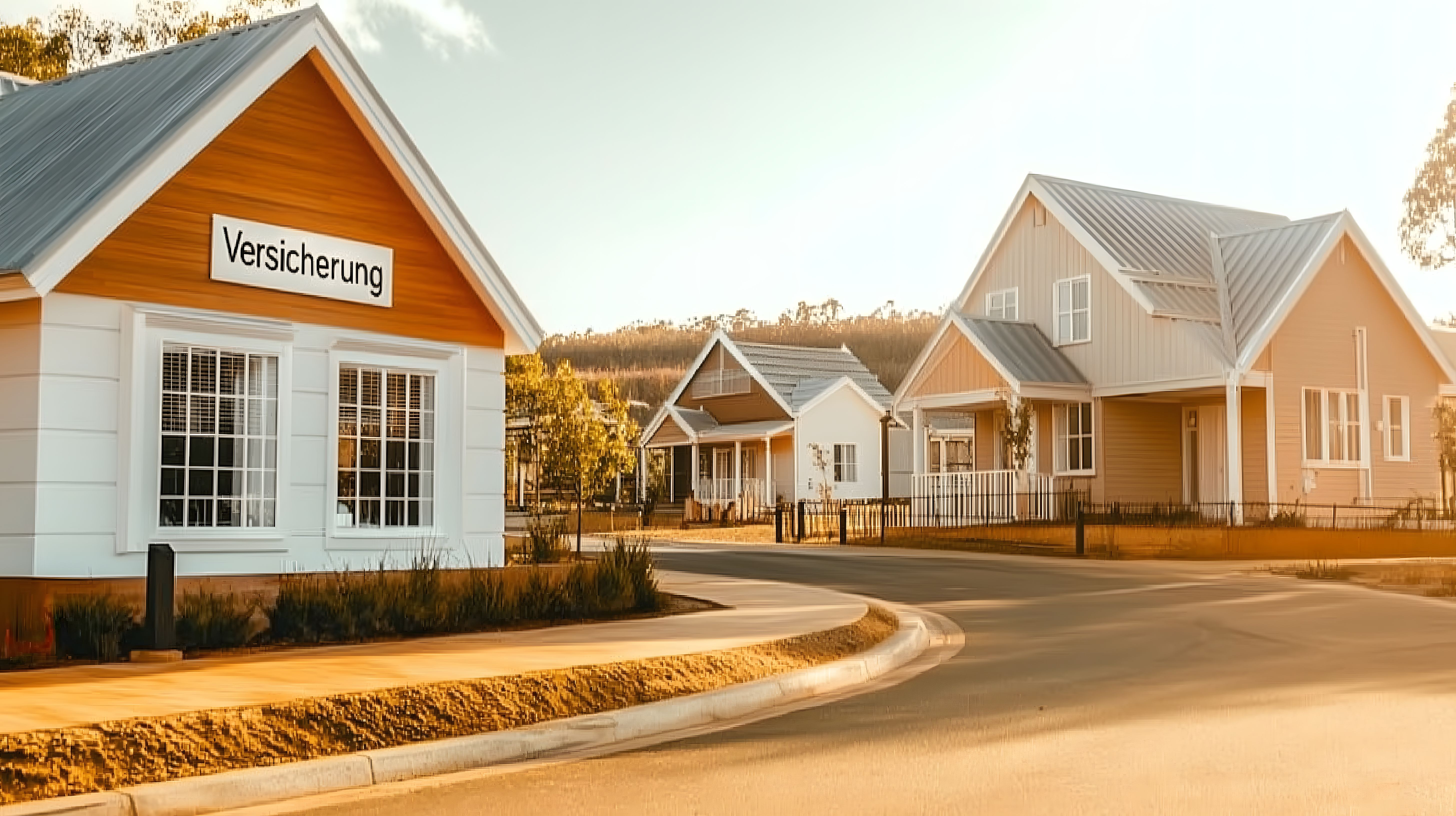 Das Bild zeigt eine idyllische Wohngegend mit modernen, attraktiv gestalteten Häusern. Im Vordergrund befindet sich ein Gebäude mit Versicherungsschild, das den Eindruck eines Versicherungsbüros oder einer Vertretung erweckt. Die Fassaden der Häuser sind in warmen, erdigen Tönen gehalten und verleihen der Umgebung einen einladenden, gemütlichen Charakter. Die umliegende Natur mit Bäumen und Gräsern rundet das friedliche Gesamtbild ab.
