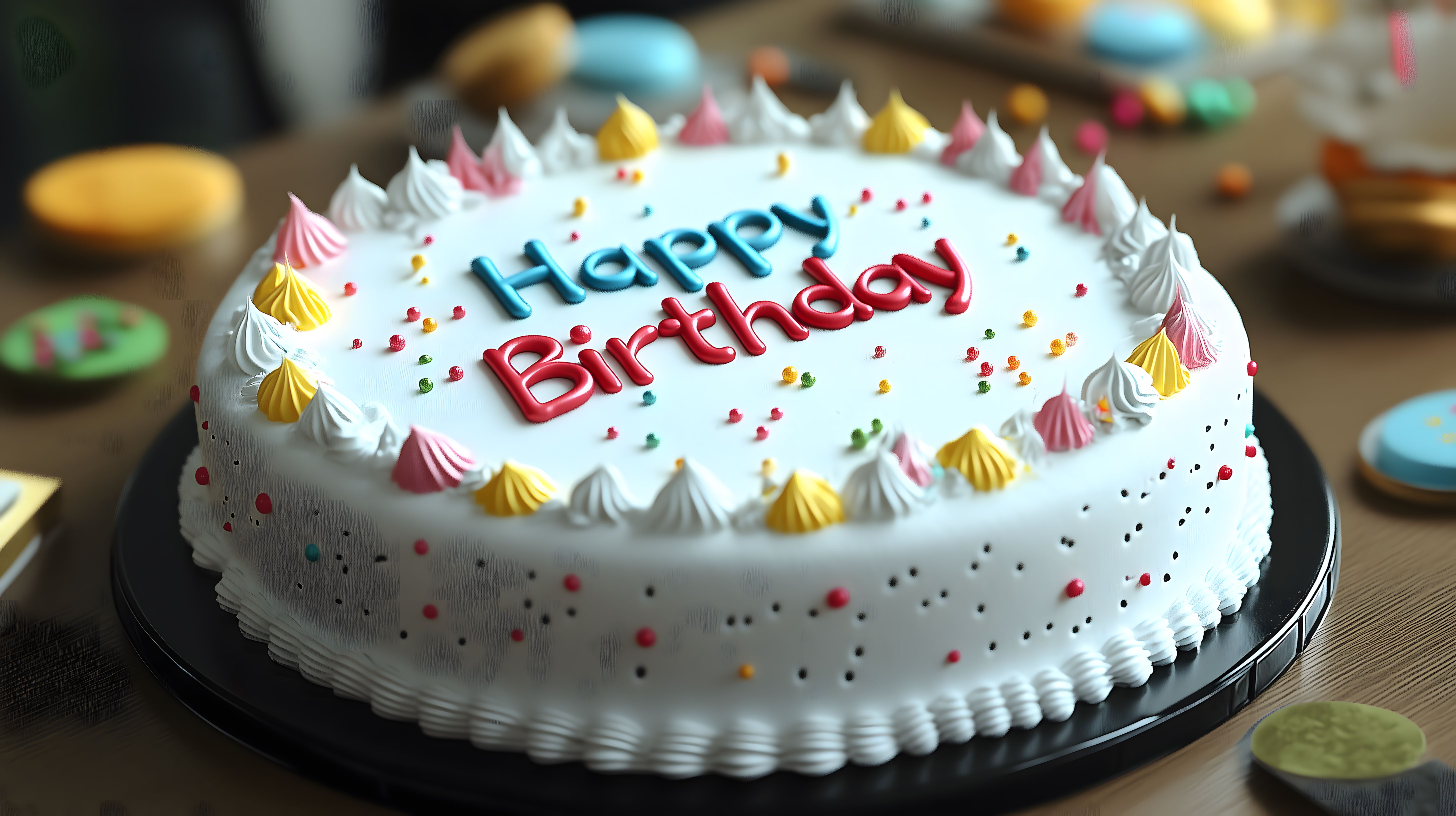 Dieses Foto zeigt eine kunstvoll dekorierte Geburtstagstorte auf einem dunklen Holztisch. Die Torte ist weiß mit bunten Verzierungen und Schriftzug 'Happy Birthday' in roter Schrift. Die Torte ist mit verschiedenen Elementen wie Sahne, Meringue-Spitzen und bunten Streuseln geschmückt, die ihr ein festliches und farbenfrohes Aussehen verleihen. Das Foto ist in einer natürlichen, ruhigen Umgebung aufgenommen, wodurch die Torte in den Fokus gerückt wird. Dieses kostenlose Stockfoto in hoher Auflösung unter Creative-Commons-Lizenz eignet sich hervorragend für die Verwendung in Blogs, Newslettern, Social-Media-Posts oder Werbematerialien rund um Geburtstage, Feiern oder süße Backrezepte.