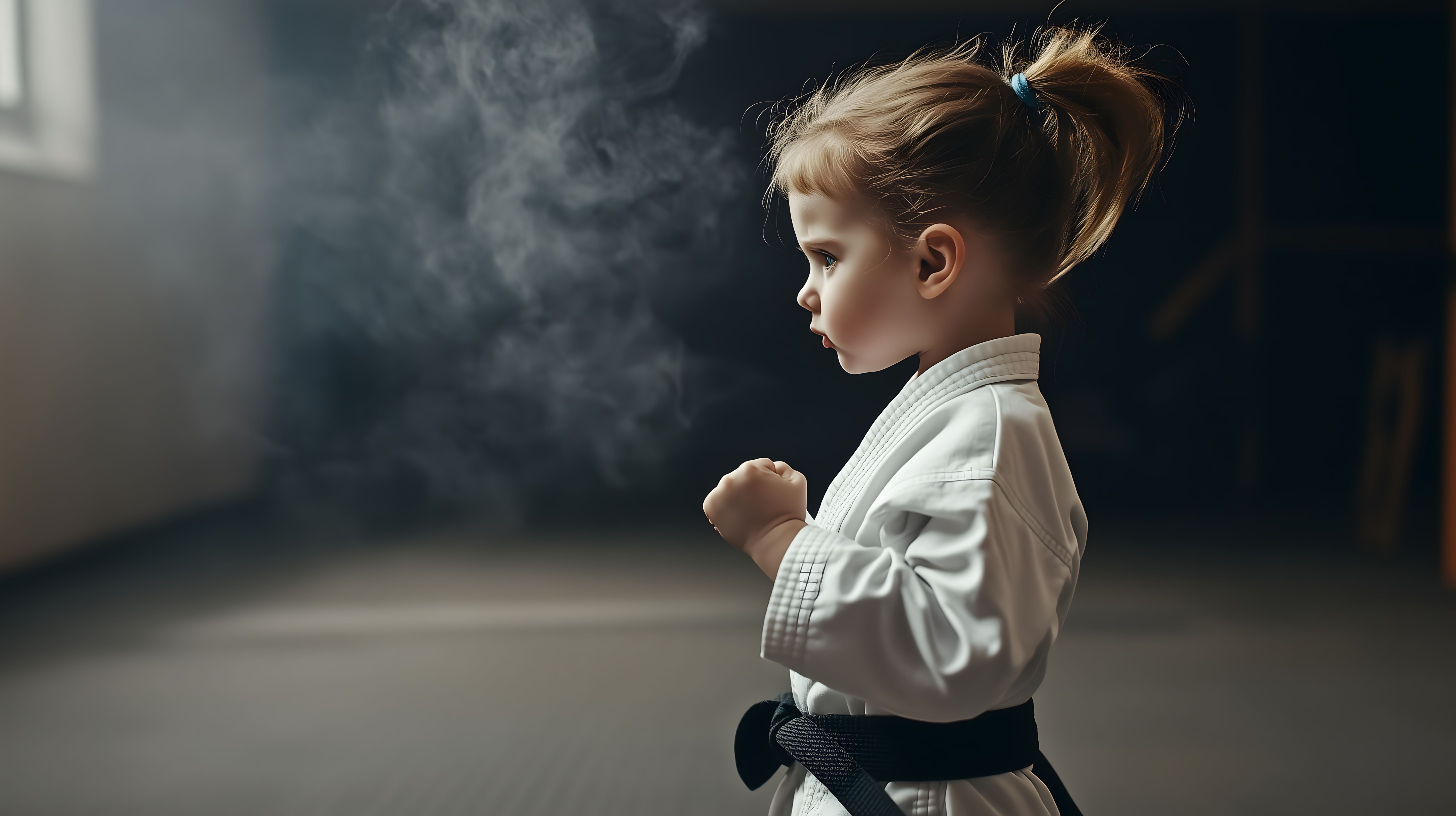 Dieses starke und eindrucksvolle Bild zeigt ein junges Mädchen in einem weißen Kampfkostüm, das sich in einer dramatischen Rauchwolke konzentriert und entschlossen positioniert. Das Kind strahlt Stärke, Energie und Fokussierung aus. Die düstere Umgebung und die Raucheffekte verleihen dem Bild eine kraftvolle, fast mystische Atmosphäre.
