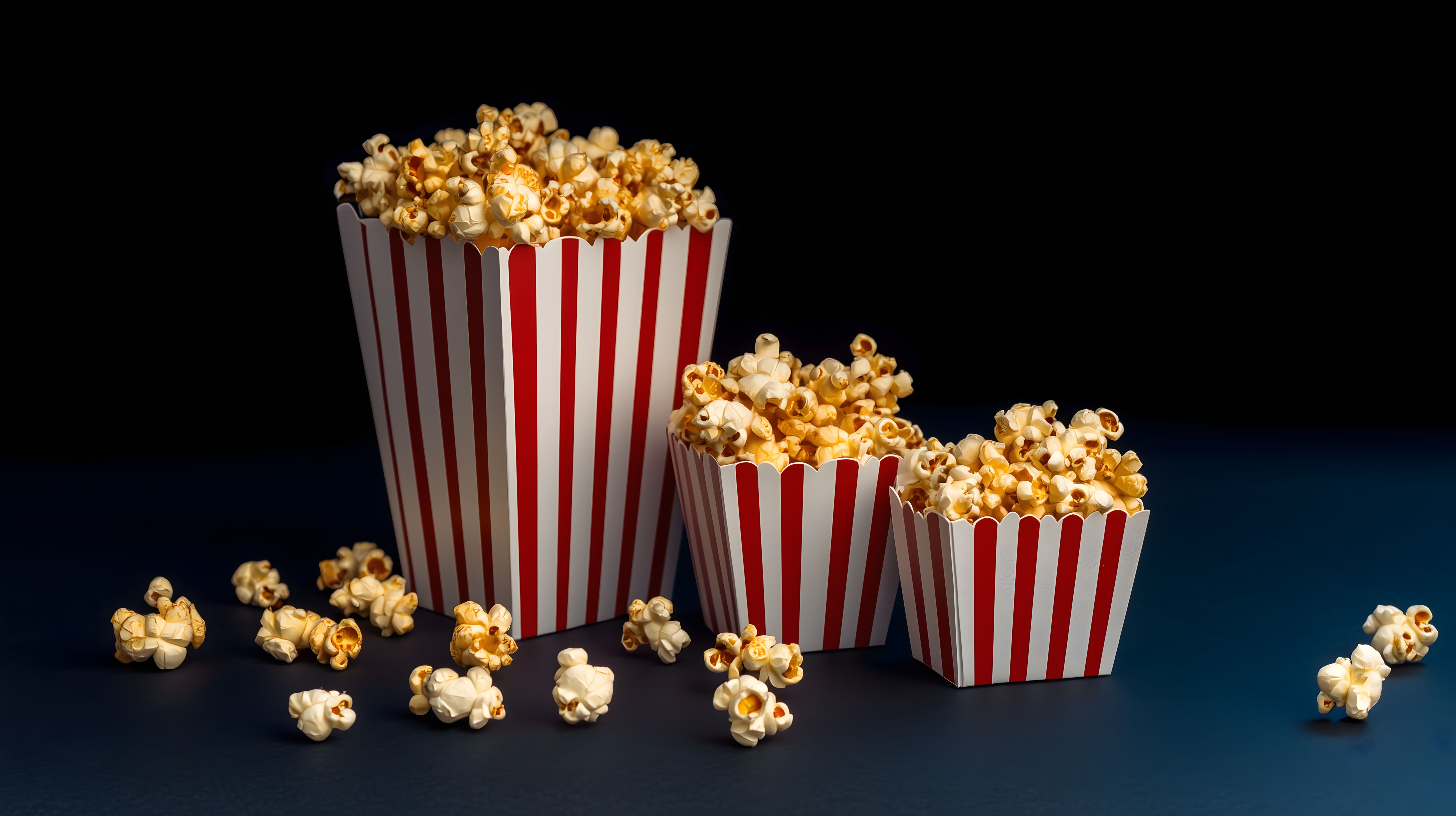 Dieses Foto zeigt mehrere rot-weiß gestreifte Popcorn-Becher, die mit frisch zubereitetem, goldgelben Popcorn gefüllt sind. Die Popcorn-Stücke liegen in unterschiedlichen Formationen auf dem schwarzen Hintergrund, was eine appetitliche und stimmungsvolle Komposition ergibt. Das klassische Kinopopcorn-Design der Becher verleiht dem Bild einen nostalgischen Retro-Charme und macht es ideal für den Einsatz in Werbung, Blogbeiträgen oder Social-Media-Posts rund um Filme, Kino oder gemütliche Feierabende.