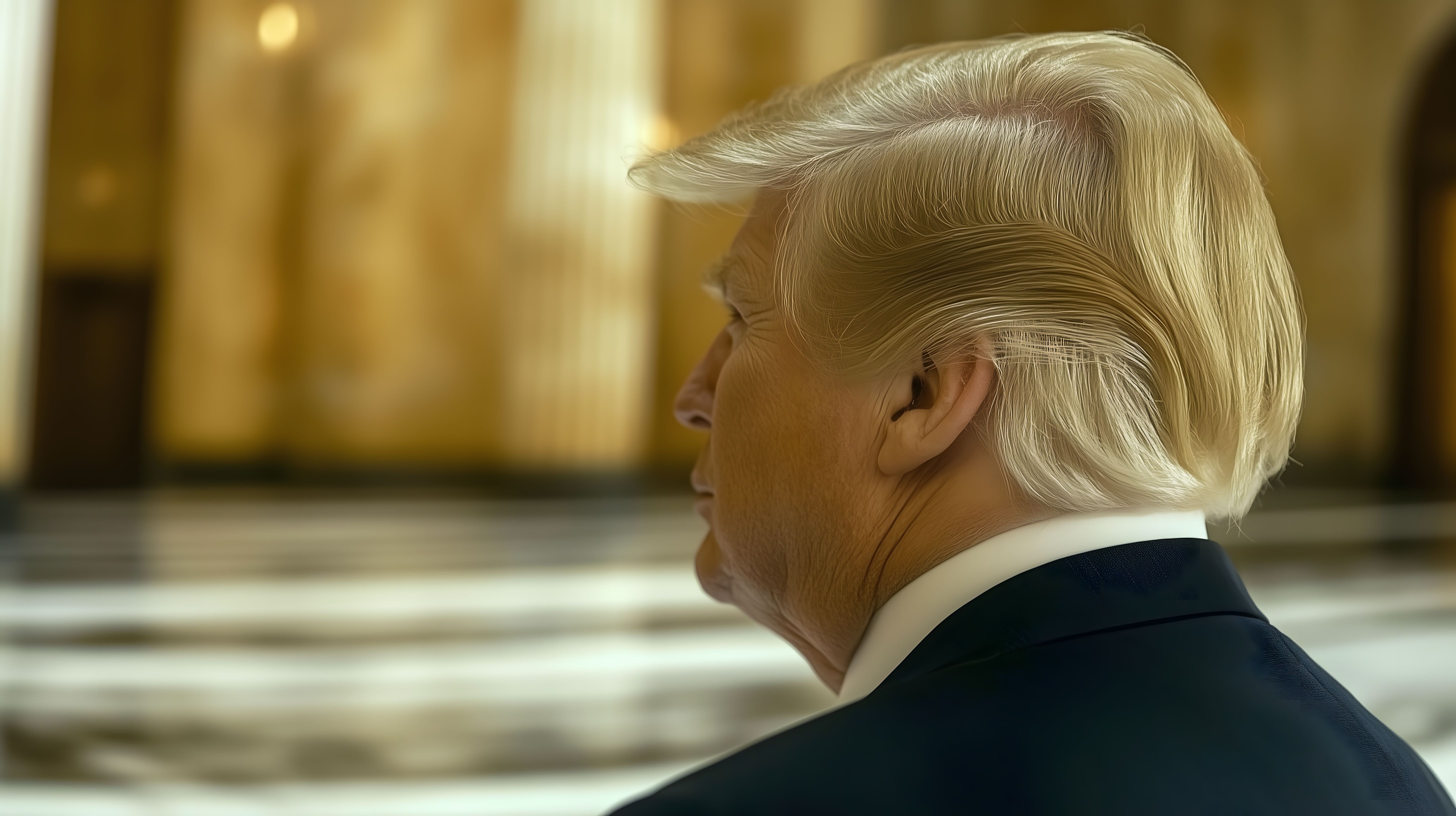 Dieses Bild zeigt eine Nahaufnahme des Gesichts des ehemaligen US-Präsidenten Donald Trump in Seitenansicht. Seine charakteristisch blonde, voluminöse Frisur ist deutlich zu erkennen. Trump trägt einen dunklen Anzug und Krawatte, was einen formellen, professionellen Eindruck vermittelt. Der Hintergrund ist verschwommen, wodurch der Fokus auf Trumps Gesichtszüge und Frisur liegt. Dieses Stockfoto eignet sich hervorragend für Beiträge über den Politiker, seine Amtszeit oder das politische Geschehen in den Vereinigten Staaten. Es ist in hoher Auflösung und unter der Creative-Commons-Lizenz frei verfügbar.