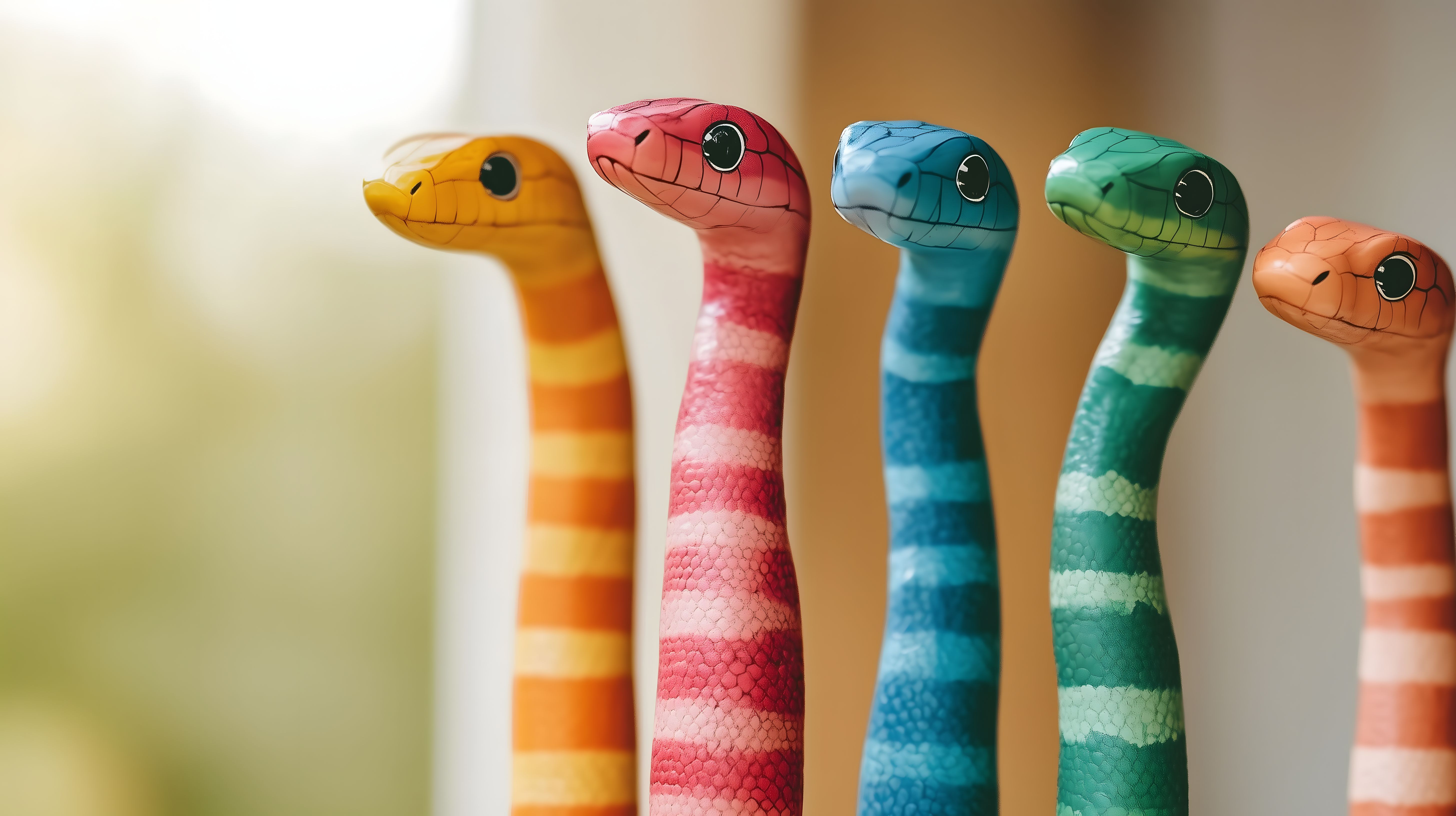 Dieses Foto zeigt eine Gruppe von fünf bunten Spielzeugschlangen in unterschiedlichen lebendigen Farben wie Orange, Pink, Blau und Grün. Die Schlangen sind aus weichem Material gefertigt und haben große, ausdrucksstarke Augen. Die Schlangen sind in einer Reihe angeordnet, was einen dynamischen und fröhlichen Eindruck vermittelt. Dieses Bild eignet sich perfekt für den Einsatz in Blogs, Newslettern, Social-Media-Beiträgen oder Werbeaktionen, bei denen ein freundliches, kinderfreundliches Motiv benötigt wird. Als hochauflösendes Stockfoto unter Creative-Commons-Lizenz ist es kostenlos für viele Zwecke verwendbar.