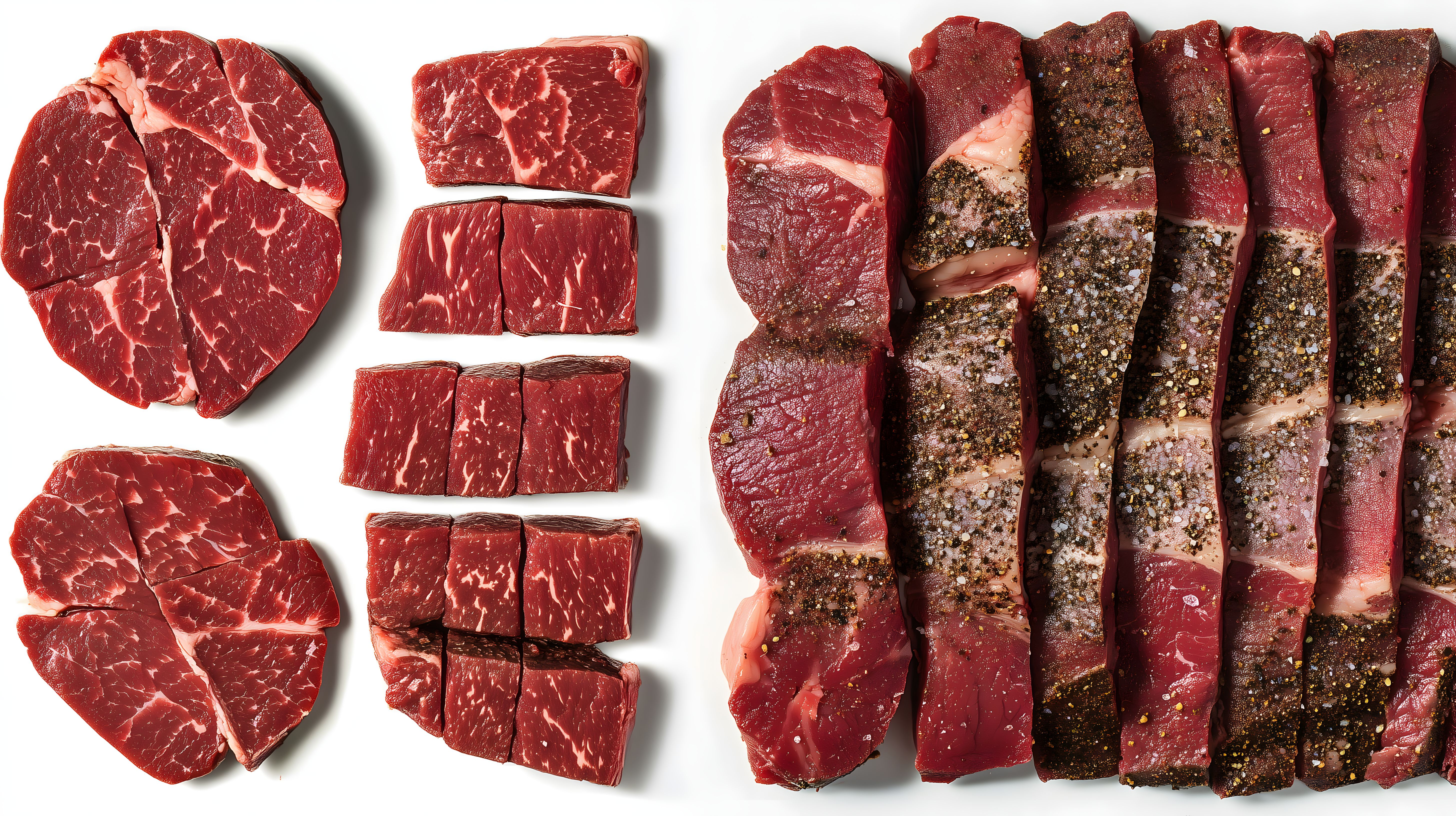 Dieses Foto zeigt eine perfekte Anordnung von rohem Rindfleisch in verschiedenen Stücken und Schnitten. Das Fleisch liegt auf einem weißen Hintergrund und ist in einer sorgfältigen, geordneten Komposition arrangiert. Die verschiedenen Teile wie Ribeye, Filet und andere Cuts sind mit Gewürzen wie Salz und Pfeffer verfeinert, was auf eine hochwertige Zubereitung und Präsentation hindeutet. Dieses Stockfoto eignet sich hervorragend für Rezepte, Kochbücher, Kochzubehör oder Werbung im Bereich der Gastronomie und Kulinarik. Es ist in hoher Auflösung verfügbar und steht unter einer kostenlosen Creative-Commons-Lizenz zur Verwendung bereit.