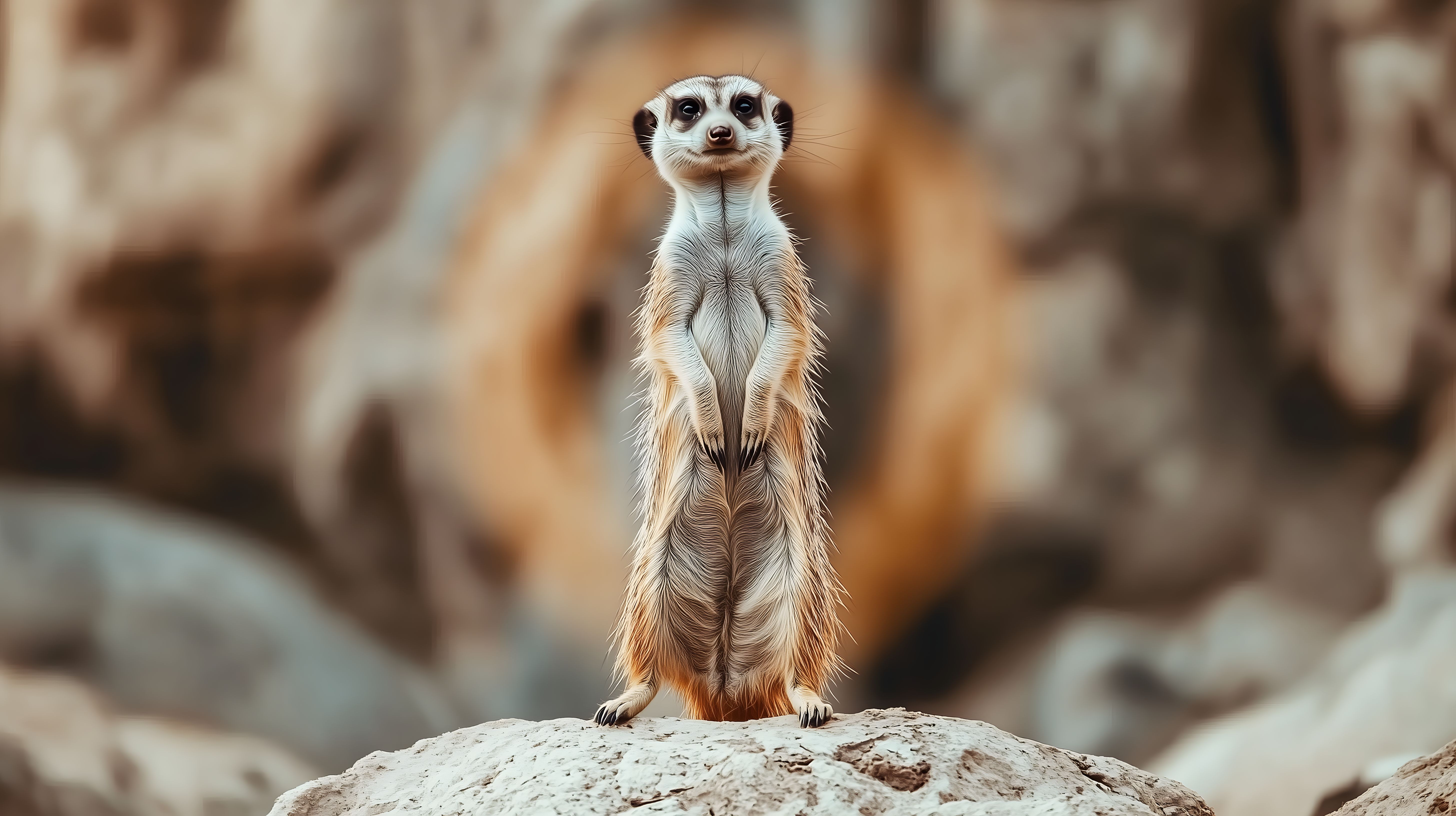 Das Foto zeigt ein Erdmännchen, das aufrecht auf einem Felsen in einer natürlichen Umgebung steht. Das Tier hat einen wachsamen, neugierigen Blick und seine Körperhaltung wirkt aufmerksam. Der Hintergrund ist unscharf, sodass der Fokus ganz auf dem Erdmännchen liegt. Die warmen Braun- und Rottöne der Landschaft bilden einen schönen Kontrast zum hellen Fell des Tieres.