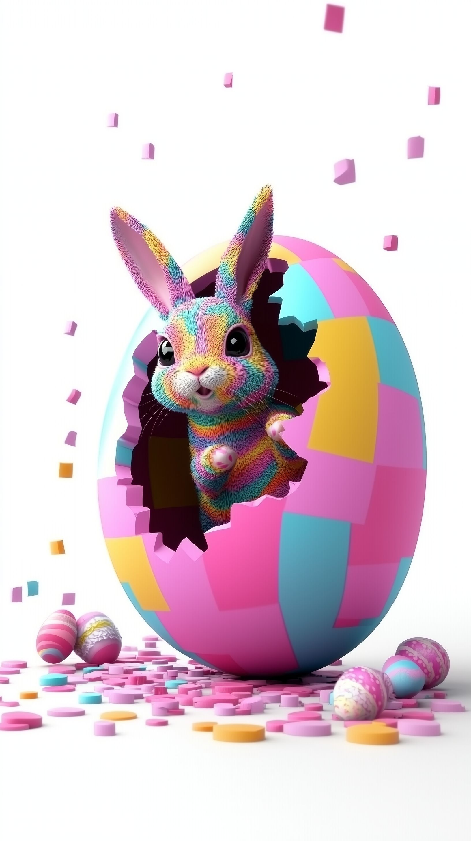 Das Bild zeigt einen farbenfrohen, animierten Osterhasen, der aus einem bunten, Regenbogenei schlüpft. Die Szene ist vor einem weißen Hintergrund dargestellt, umgeben von kleineren Würfelformen in verschiedenen Pastellfarben. Das Bild strahlt eine verspielt-magische Stimmung aus und eignet sich hervorragend als Dekoration, Einladung oder Titelbild für Ostergrüße, Frühlingskampagnen oder kindgerechte Inhalte. Als kostenloses Stockfoto in hoher Auflösung und unter Creative-Commons-Lizenz verfügbar.