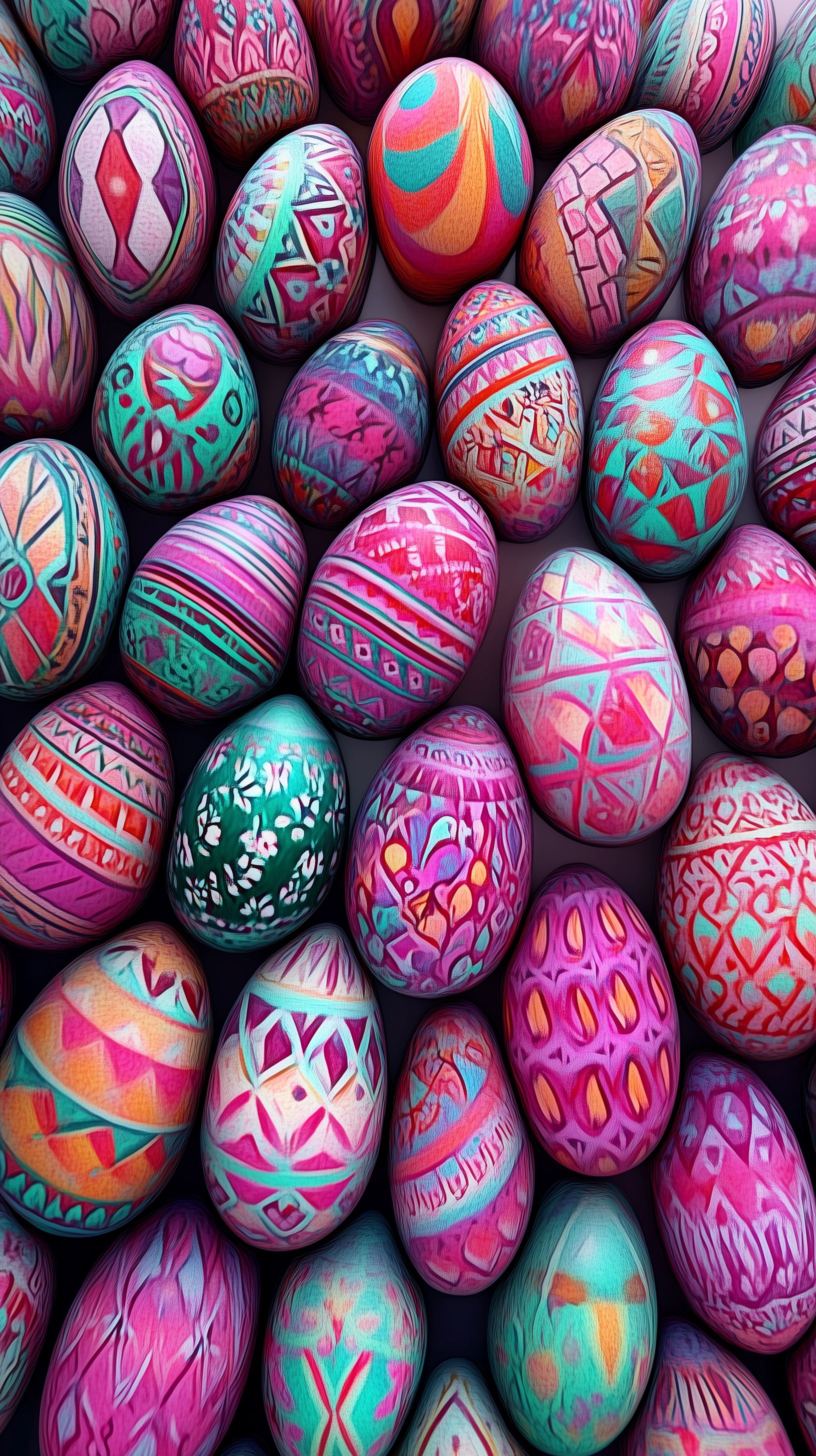 Das Bild zeigt eine Nahaufnahme von bunt bemalten Ostereiern in kräftigen Farben wie Pink, Türkis, Grün und Orange. Die Eier wurden offenbar von Hand bemalt und weisen eine Vielzahl an organischen, traditionellen Mustern und Designs auf. Die Komposition ist sehr dicht und farbintensiv, was dem Bild eine lebendige und dekorative Wirkung verleiht. Diese Aufnahme eignet sich hervorragend als kostenloses Stockfoto für Blogs, Newsletter, Social-Media-Beiträge oder Werbekampagnen rund um das Oster-Thema. Das hochauflösende Bild steht unter einer Creative-Commons-Lizenz zur Verfügung.