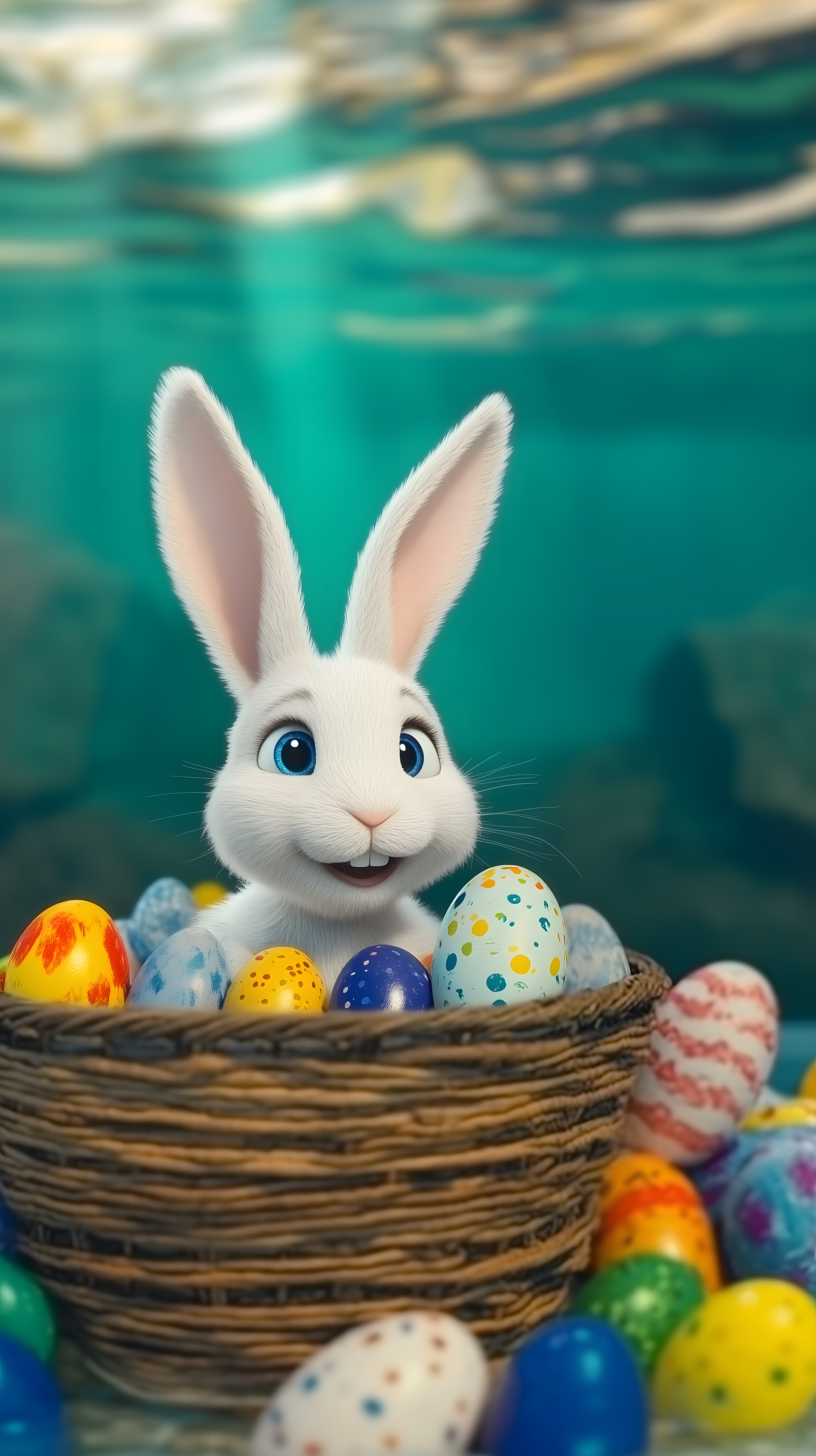 Dieses süße Bild zeigt einen freundlichen, weißen Osterhasen, der in einem Weidenkorb sitzt und von bunten, bemalten Ostereiern umgeben ist. Die Szenerie spielt vor einem verschwommenen, türkisfarbenen Hintergrund, der an ein Unterwasser-Ambiente erinnert. Das Foto ist perfekt geeignet für Oster-Grußkarten, Einladungen, Blogs oder Social-Media-Beiträge rund um den Frühlingsfeiertag. Das hochauflösende Stockfoto steht unter einer Creative Commons-Lizenz zur freien Verwendung zur Verfügung.