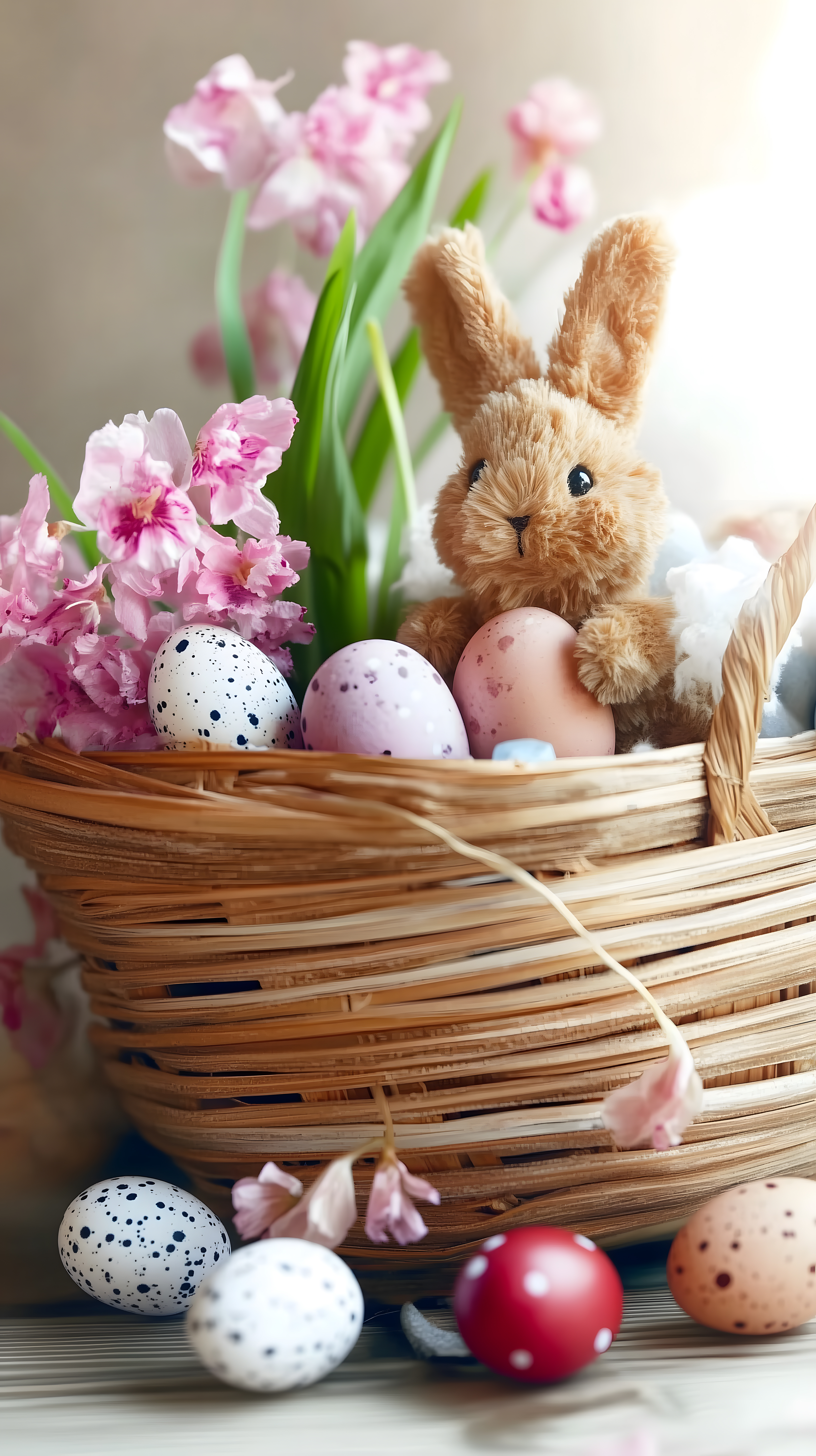 Dieses wunderschöne Stockfoto zeigt einen liebevoll gestalteten Osterkorb voller saisonaler Dekorationen. Im Zentrum des Bildes befindet sich ein Weidenkorb, der mit bunten Ostereiern, einem niedlichen Plüschhäschen und frischen Frühlingsblumen wie Narzissen und Tulpen gefüllt ist. Die Komposition ist stimmungsvoll in warmen, pastelligen Farbtönen gehalten und vermittelt eine heitere, festliche Atmosphäre. Das Foto eignet sich hervorragend für die Verwendung in Ostergrüßen, Blogbeiträgen, Newslettern oder Werbematerialien rund um das Osterfest. Als kostenloses, hochauflösendes Stockfoto unter Creative-Commons-Lizenz bietet es viele Möglichkeiten für kreative Projekte.