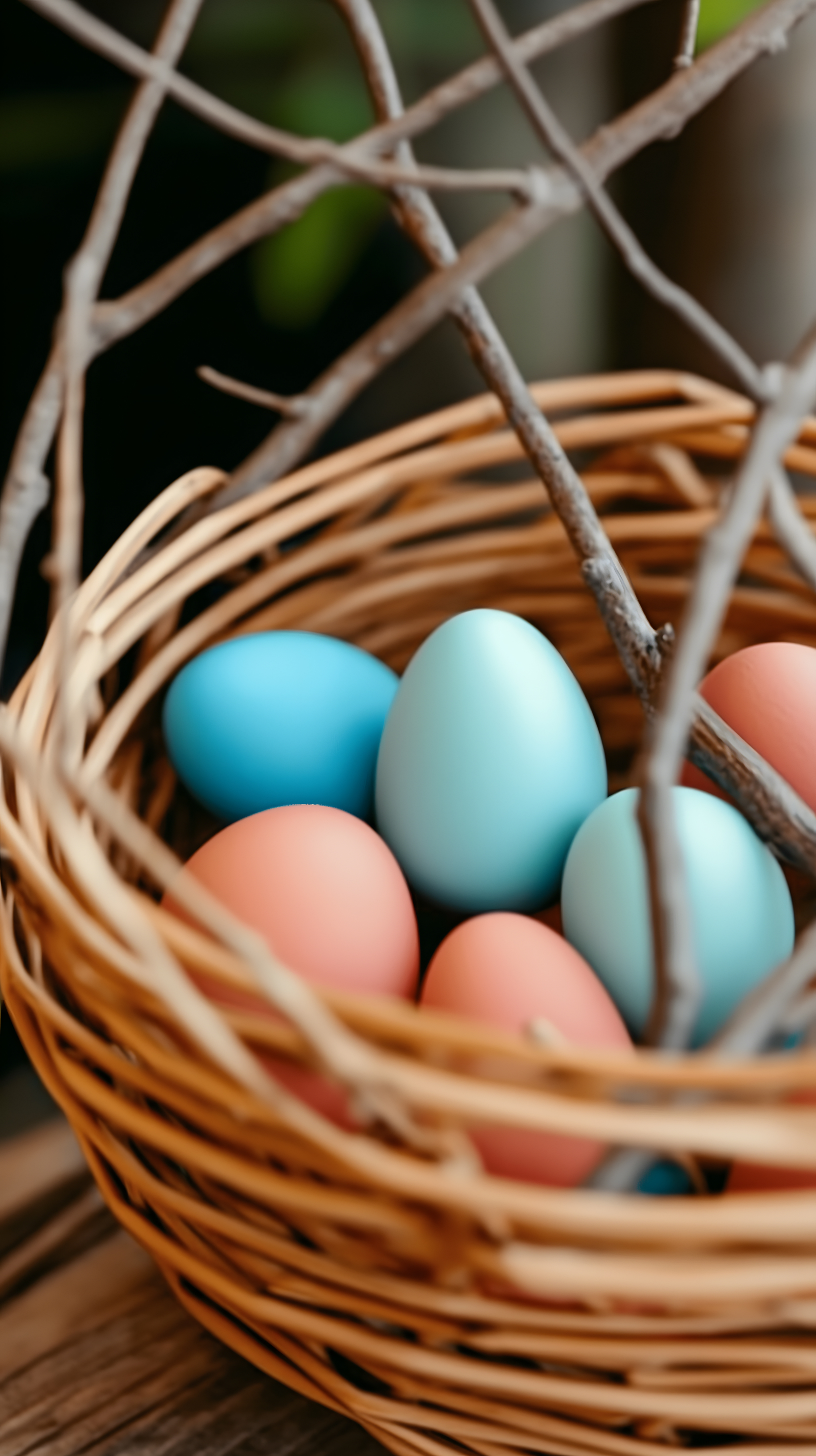 Dieses Foto zeigt einen rustikalen Weidenkorb, in dem bunte Ostereier in Pastelltönen platziert sind. Die Eier heben sich kontrastreich vom dunklen Hintergrund ab und verleihen dem Arrangement eine frische, frühlingshafte Atmosphäre. Die Komposition mit den verschlungenen Ästen und der Tiefenschärfe lenken den Blick direkt auf die Hauptmotive - die Ostereier. Dieses Stockfoto eignet sich hervorragend für Oster-Dekorationen, Blogbeiträge, Social-Media-Postings oder Werbematerialien rund um das Osterfest. Es ist hochauflösend und kann unter einer Creative-Commons-Lizenz kostenlos verwendet werden.