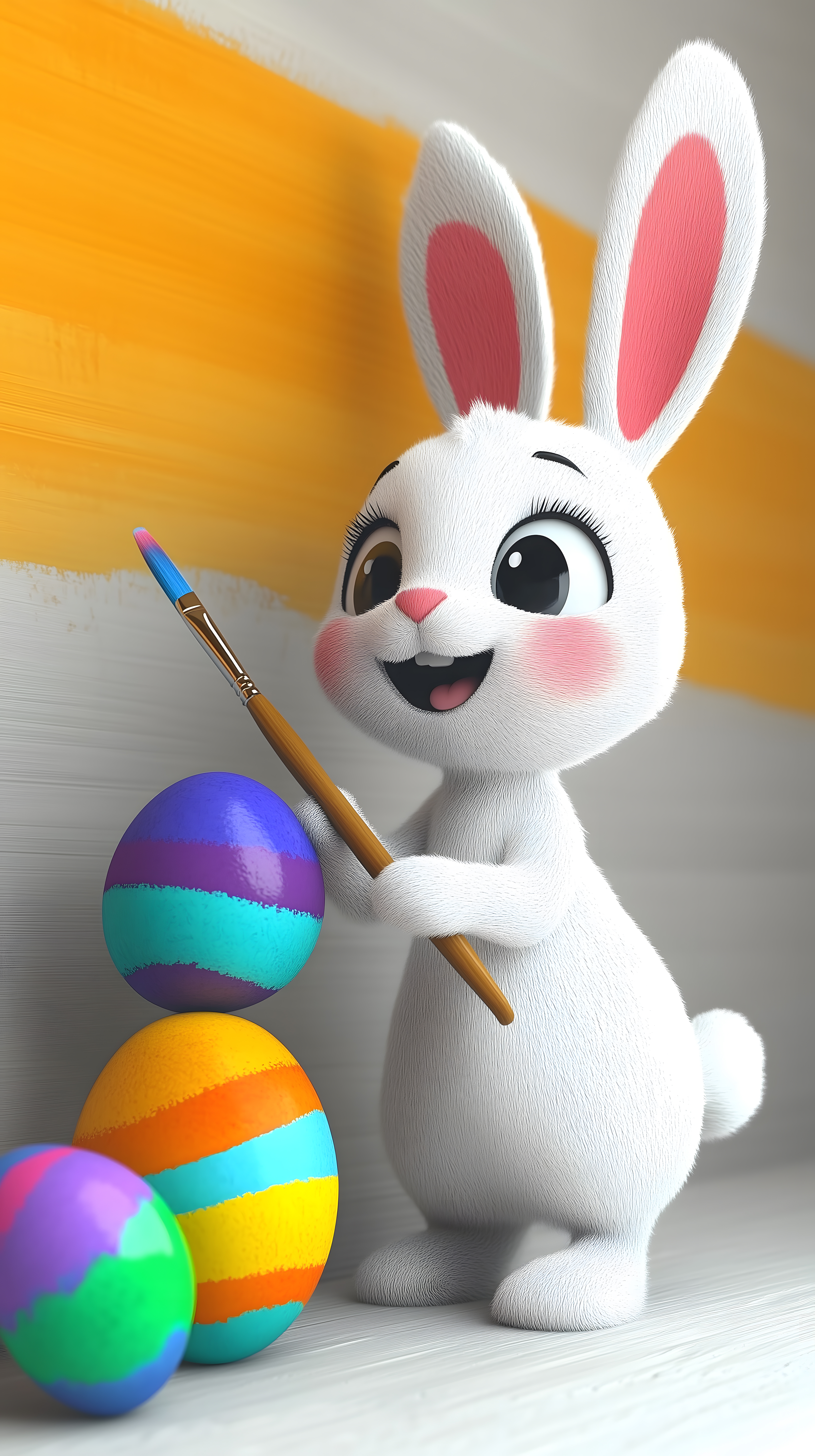 Das Bild zeigt ein niedliches Ostermaskottchen, einen weißen Hasen mit großen, rosa Ohren. Das Häschen hält einen blauen Pinsel in der Hand und bemalt bunte, gestreifte Ostereier, die auf einem Holztisch vor ihm stehen. Der Hintergrund ist einfarbig, sodass der Fokus ganz auf dem fröhlichen Osterhasen und seinem Osterdekor liegt. Diese detaillierte 3D-Illustration in leuchtenden Pastelltönen eignet sich hervorragend als Motiv für Ostergrußkarten, Werbe-Posts in den sozialen Medien oder als Titelbild für Osterblogs. Das Bild steht als hochwertiges, kostenloses Stockfoto unter der Creative-Commons-Lizenz zur Verfügung.