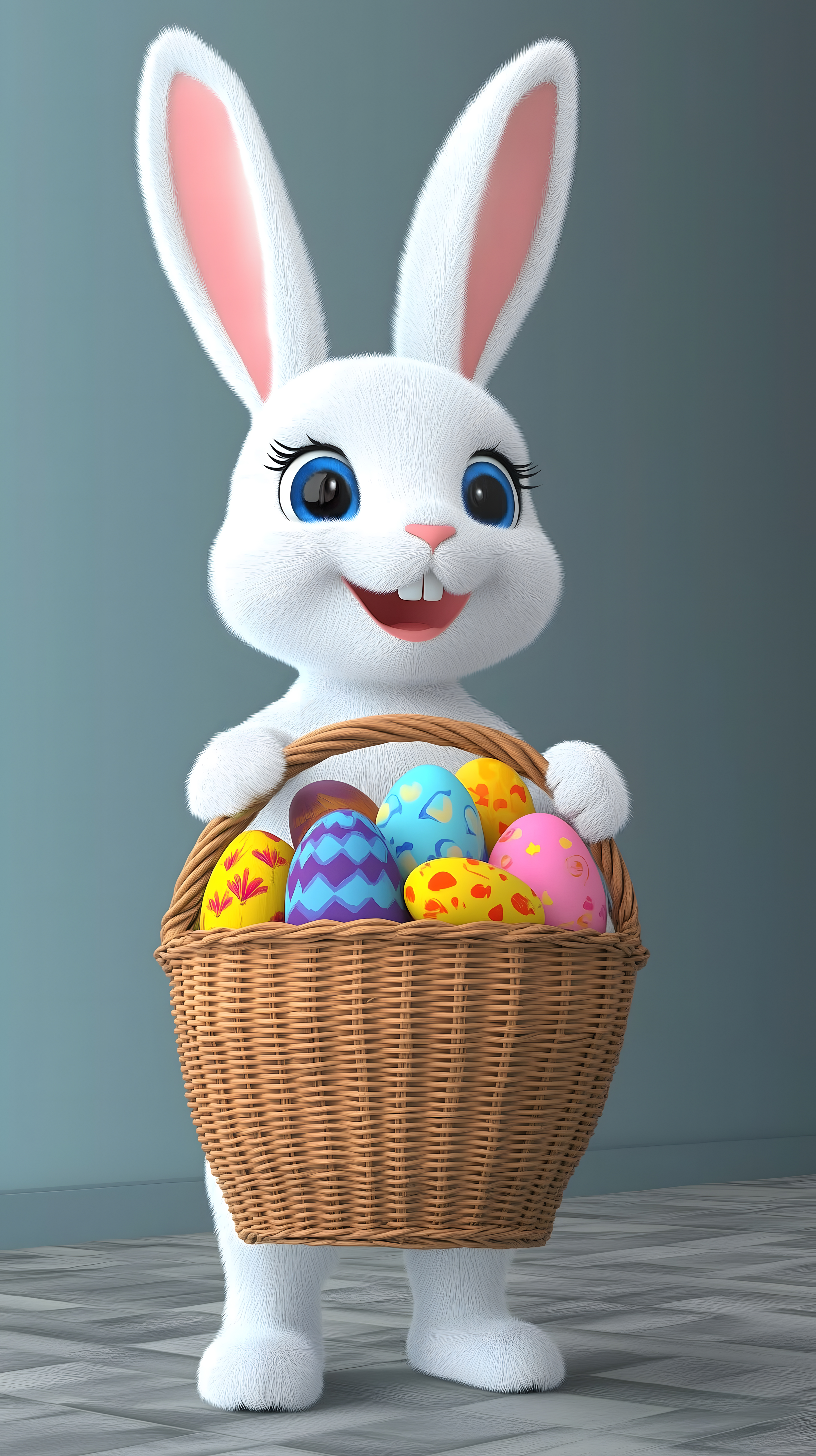 Das Bild zeigt einen freundlichen, weißen Osterhasen, der einen Korb voller bunter Ostereier präsentiert. Der Hase hat große, aufgestellte Ohren, blaue Augen und ein lachendes Gesicht, das Freude und Fröhlichkeit ausstrahlt. Der Korb ist aus Korbgeflecht gefertigt und enthält eine bunte Vielfalt an farbenfrohen Eiern in Gelb, Blau, Lila und Rosa. Die Szene vermittelt eine festliche, frühlinghafte Stimmung und ist ideal als kostenloses Stockfoto für Ostern, Feiertage, Dekoration oder Kinderthemen einsetzbar. Das hochauflösende Bild steht unter einer Creative-Commons-Lizenz zur Verwendung zur Verfügung.