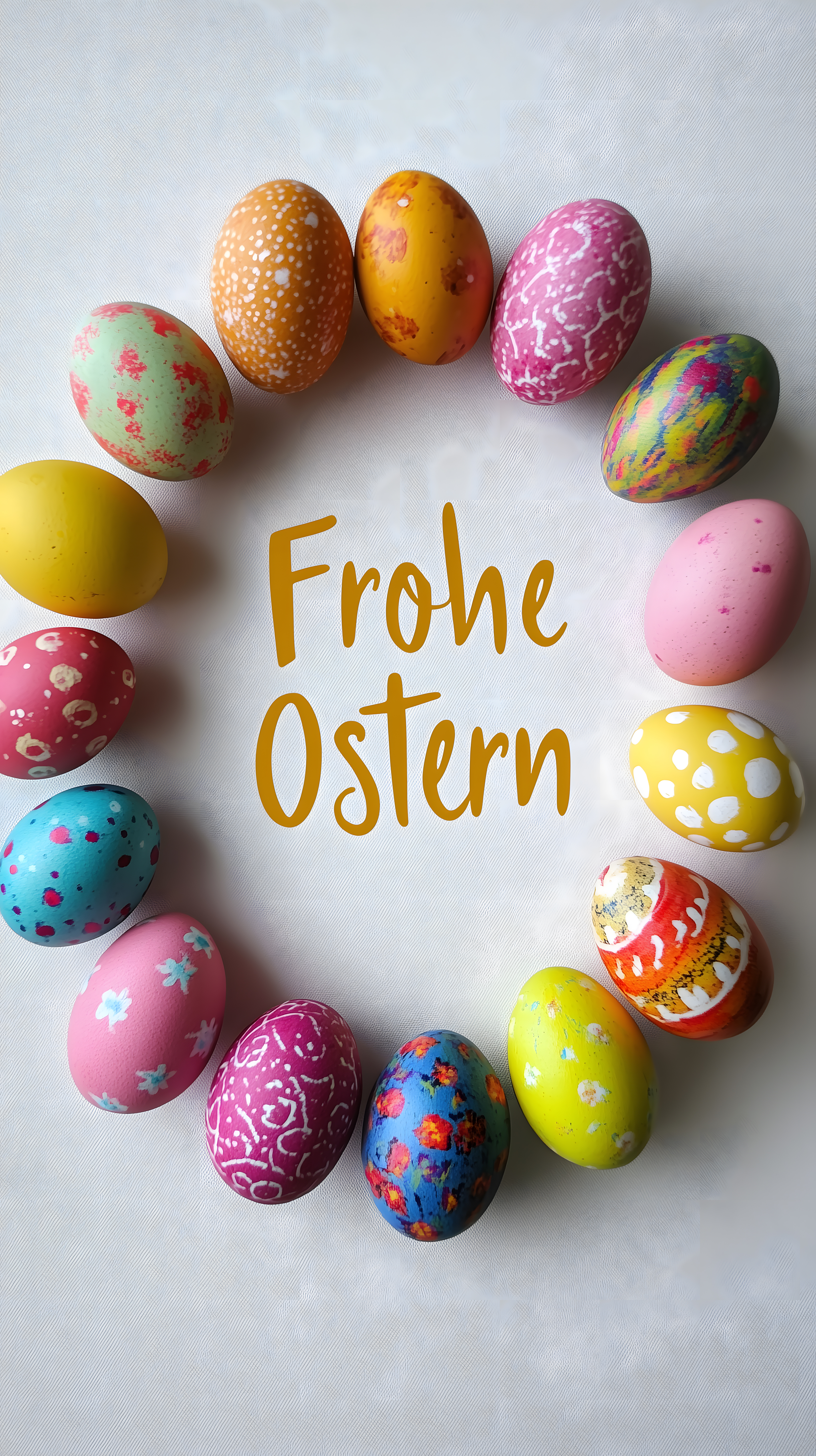 Dieses fröhliche Osterfoto zeigt einen Kranz aus bunten, handbemalten Eiern in verschiedenen Farben und Mustern. In der Mitte befindet sich ein goldener Schriftzug mit der Aufschrift 'Frohe Ostern'. Die Komposition ist symmetrisch und natürlich angeordnet, was eine harmonische und einladende Atmosphäre schafft.