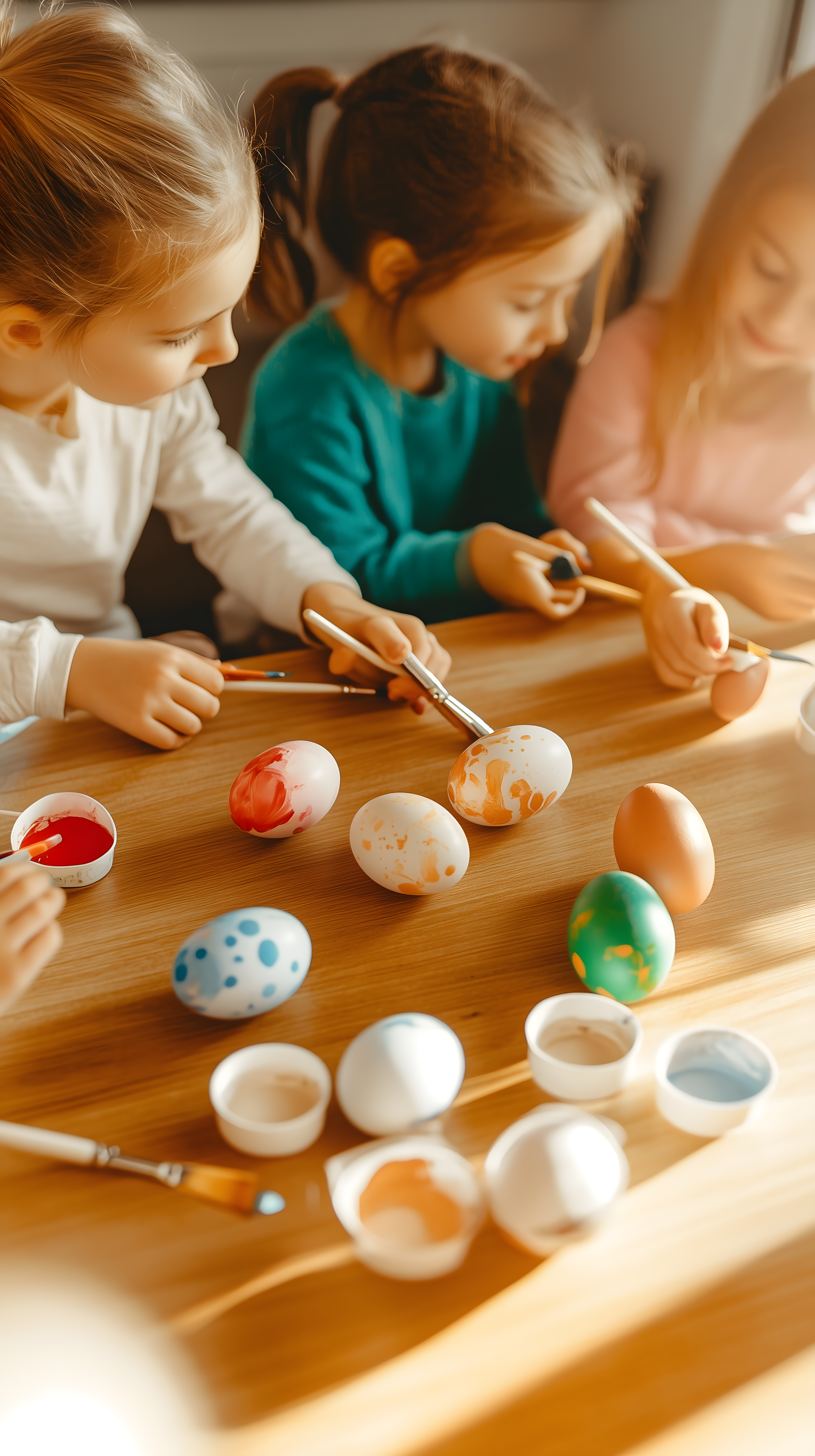 Das Foto zeigt eine gemütliche Szene, in der mehrere Kinder an einem Holztisch sitzen und Ostereier bemalen. Die Kinder sind konzentriert bei der Sache und nutzen verschiedene bunte Farben, um ihre Eier individuell zu gestalten. Die helle, natürliche Beleuchtung und die warmen Farbtöne schaffen eine einladende und freudige Atmosphäre. Dieses Bild eignet sich perfekt für Oster-Dekorationen, Kinderactivities oder Familien-Anzeigen in Blogs, Newslettern oder sozialen Medien. Als kostenloses, hochauflösendes Stockfoto unter Creative-Commons-Lizenz kann es vielfältig und ohne Einschränkungen genutzt werden.