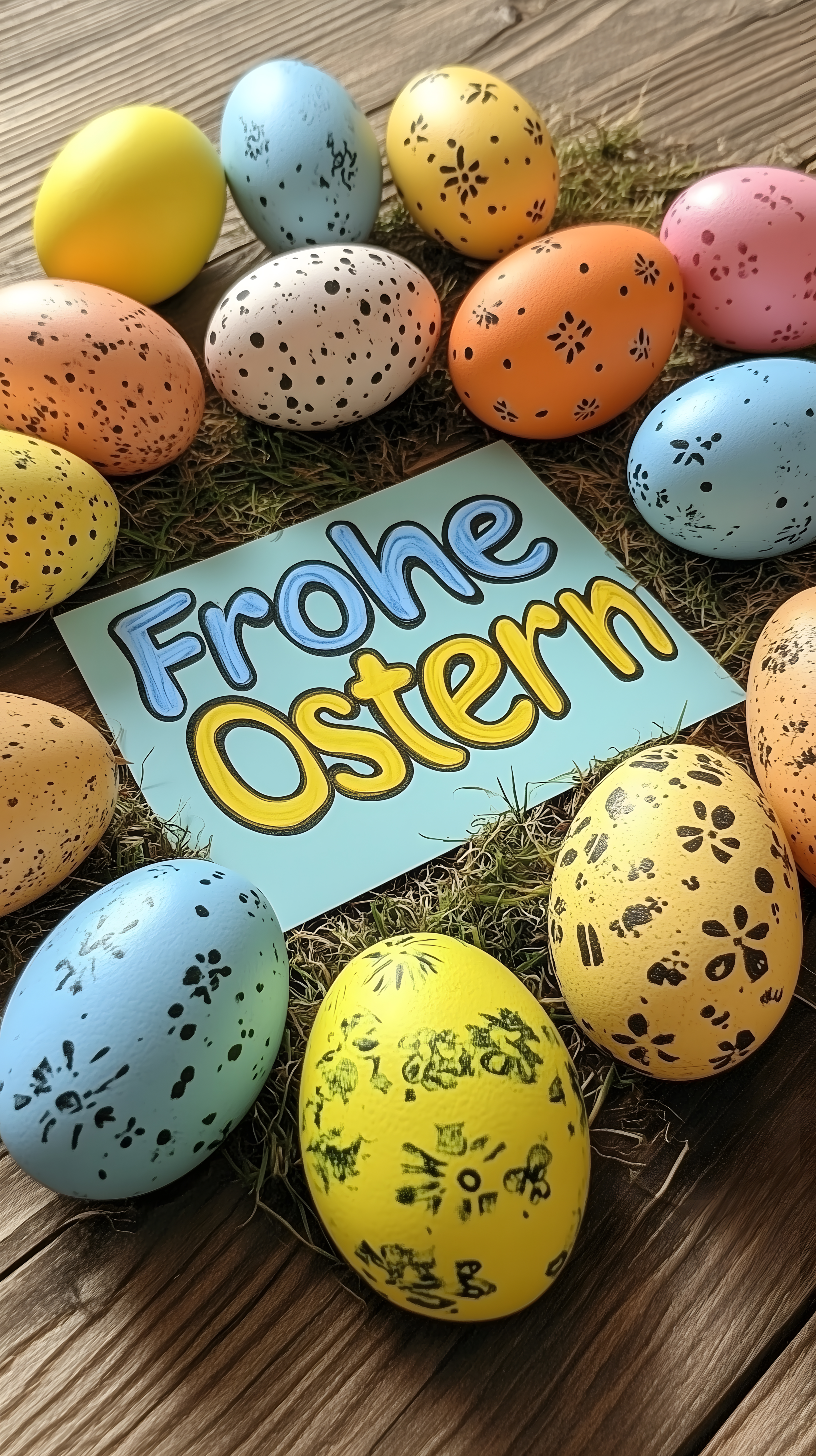 Das Foto zeigt eine Anordnung verschiedenfarbiger und gemusterter Ostereier auf grünem Gras. Dazu ist eine Grußkarte mit der Aufschrift 'Frohe Ostern' zu sehen. Die Ostereier in Blau, Gelb, Orange und Rosa verleihen dem Bild eine fröhliche, festliche Atmosphäre. Die Aufnahme eignet sich hervorragend als kostenloses Stockfoto für Blogs, Social Media-Beiträge oder Werbematerialien rund um das Osterfest. Das hochauflösende Bild steht unter einer Creative Commons-Lizenz zur Verfügung.