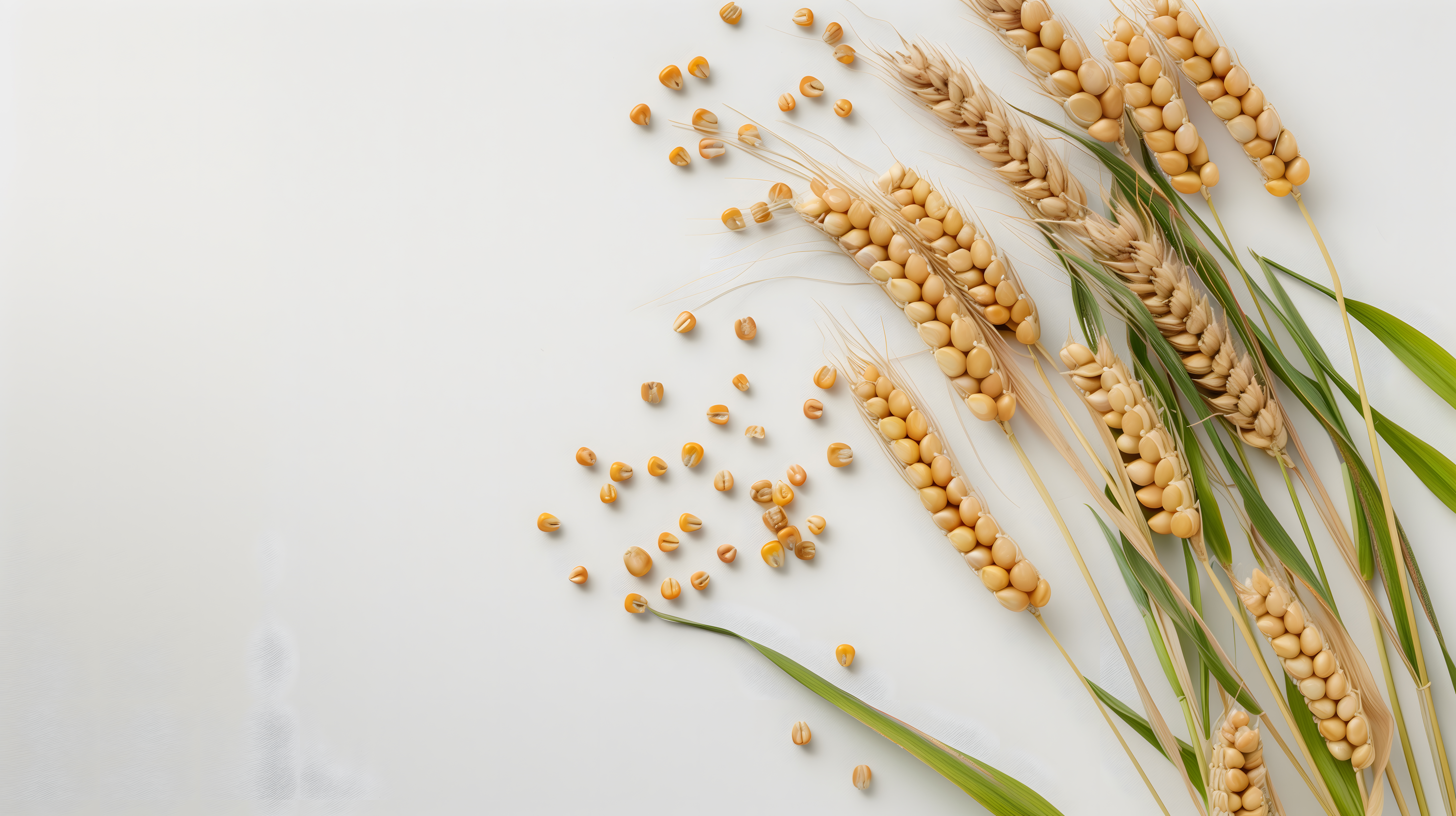 Dieses Foto zeigt eine Ansammlung reifer Getreidekörner und Weizenähren auf einem weißen Hintergrund. Die Komposition ist minimalistisch und fokussiert sich ganz auf die natürlichen Texturen und Formen der Getreidepflanzen. Die goldenen Farbtöne der Körner und Ähren schaffen eine warme, saubere Atmosphäre. Dieses Stockfoto eignet sich hervorragend für Beiträge in Blogs oder Social-Media-Kanälen rund um Themen wie gesunde Ernährung, Clean Eating oder nachhaltige Landwirtschaft. Es ist in hoher Auflösung und unter einer Creative-Commons-Lizenz verfügbar.