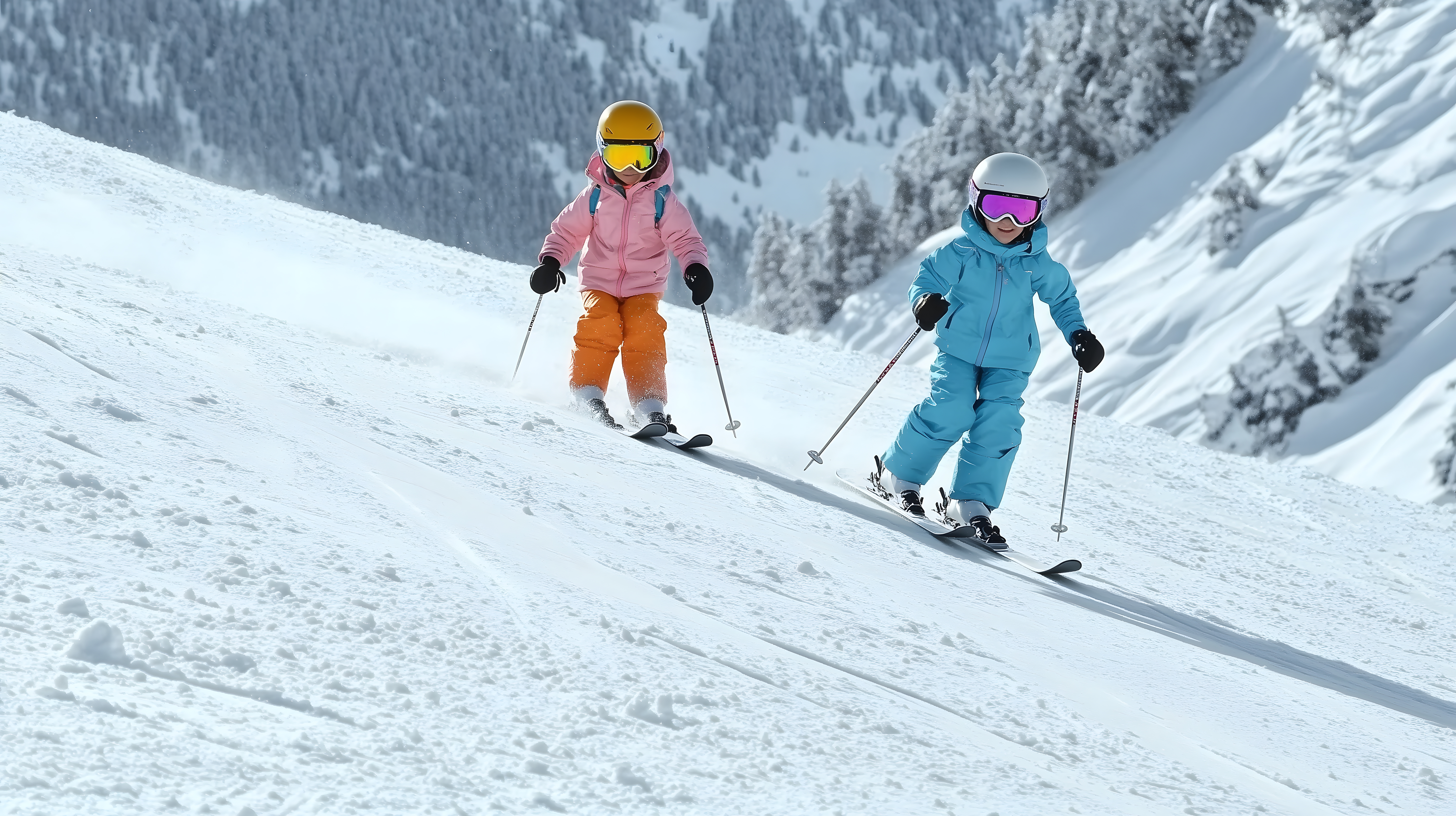 Das Bild zeigt zwei Kinder, die vergnügt auf einer verschneiten Piste im Winterland Ski fahren. Mit ihren bunten Skikleidungen und Helmen sind sie perfekt für die kalten Temperaturen ausgestattet. Die weiße Landschaft im Hintergrund, umgeben von schneebedeckten Bergen, verleiht der Szene eine idyllische Winterstimmung. Dieses hochauflösende Stockfoto eignet sich hervorragend für die Verwendung in Blogbeiträgen, Newslettern, Social-Media-Kanälen oder Werbematerialien rund um Winter, Wintersport und Familienurlaub. Es steht unter der Creative-Commons-Lizenz zur kostenlosen Nutzung zur Verfügung.