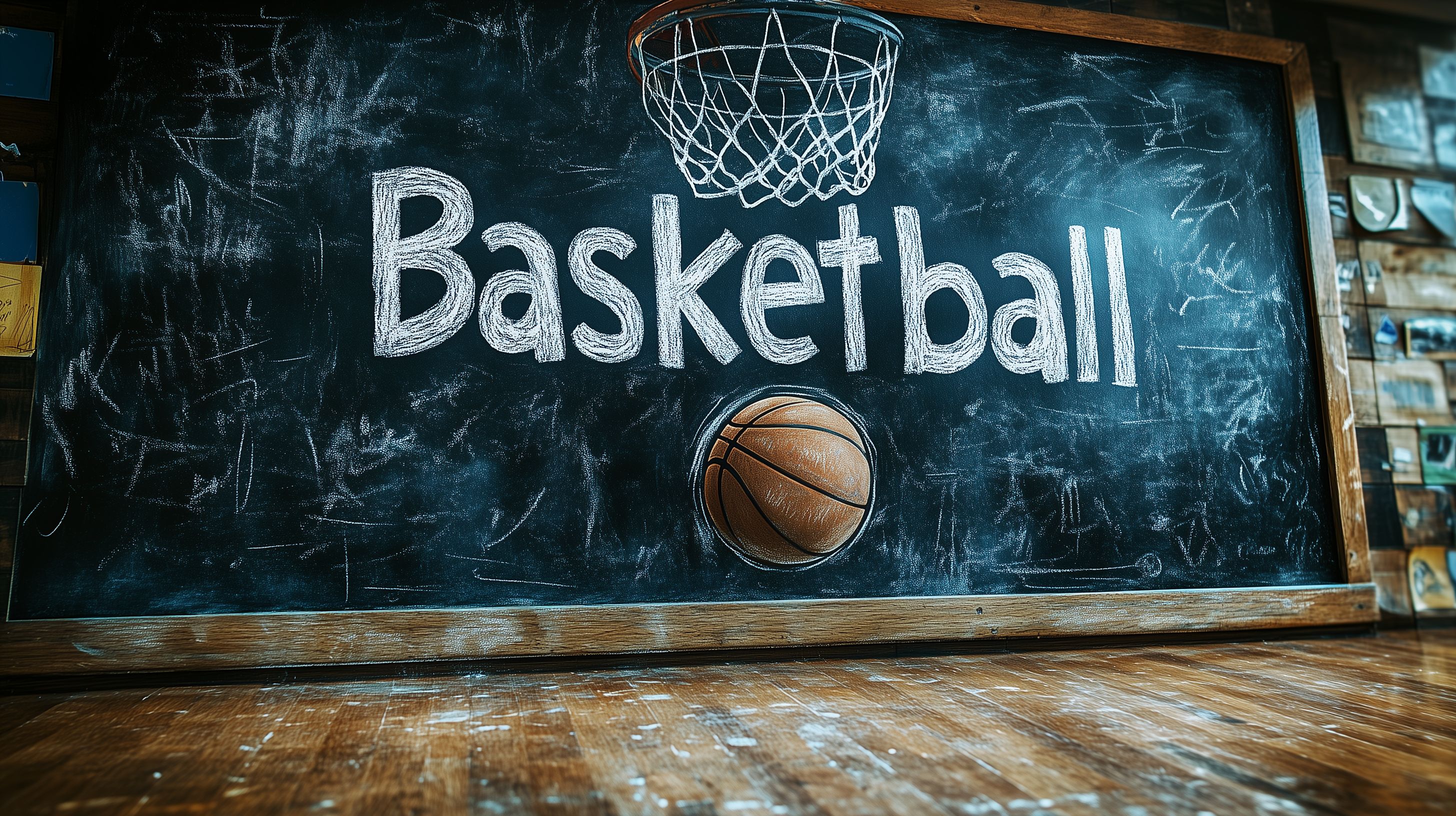 Das Bild zeigt einen Basketballkorb und einen Basketball vor einer alten Kreidetafel in einer Sporthalle. Der Basketballkorb ist aus Metall und hängt über einem Holzboden. Der Basketball liegt direkt darunter auf dem Boden. Auf der Kreidetafel ist in weißer Kreide das Wort 'Basketball' geschrieben, was den sportlichen Kontext des Bildes unterstreicht. Die Tafel ist mit Kratzern und Spuren der Nutzung überzogen, was einen vintage, rustikalen Charakter vermittelt. Das Bild eignet sich gut als kostenloses Stockfoto für Blogs, Social-Media-Beiträge oder Werbekampagnen rund um den Sport, insbesondere Basketball. Die hohe Auflösung und Creative-Commons-Lizenz erlauben eine flexible Verwendung in verschiedenen digitalen Projekten.