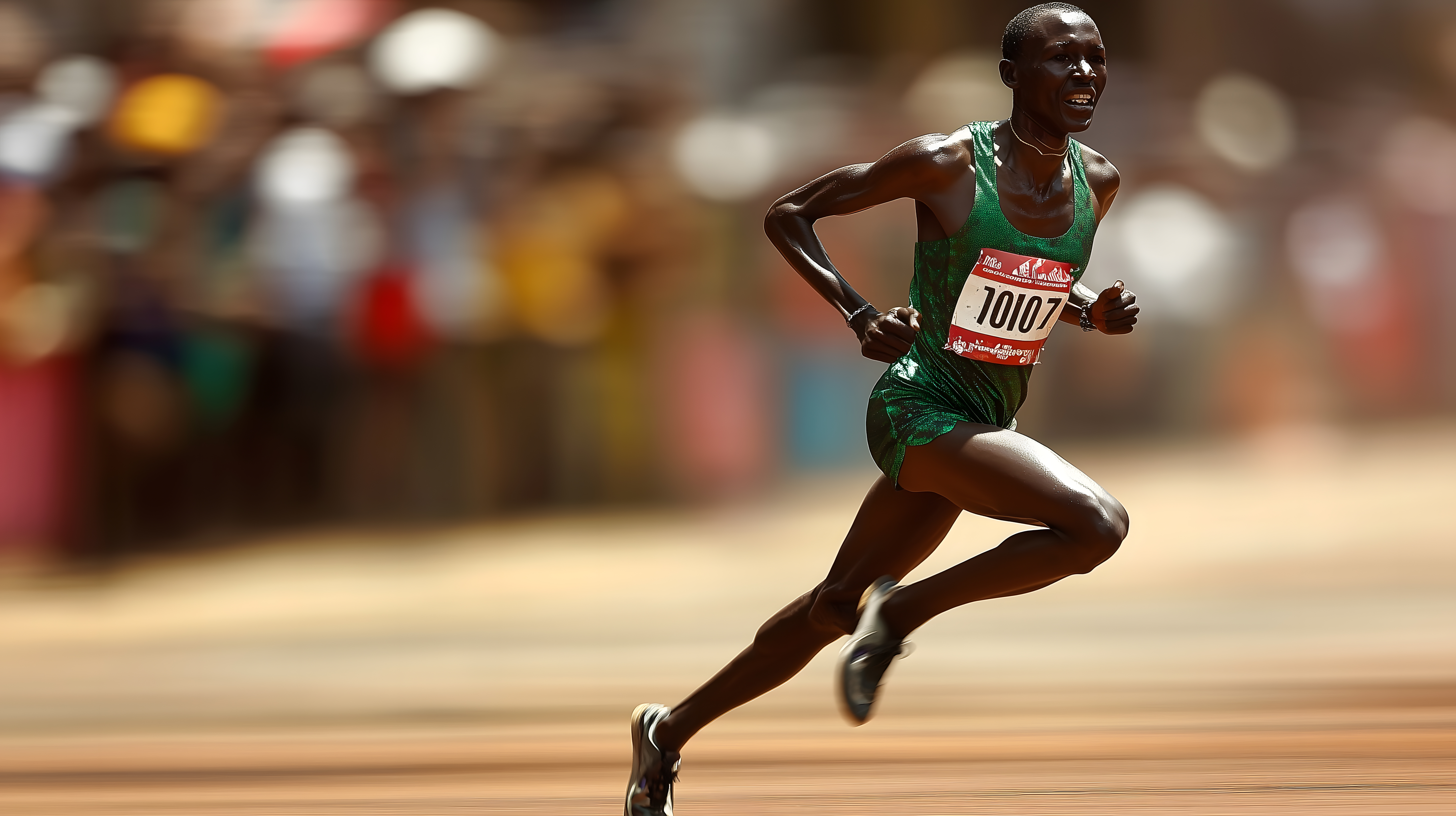 Das Bild zeigt einen kenianischen Marathonläufer in Höchstform, der voller Energie und Konzentration über die Ziellinie läuft. Mit seinem grünen Trikot hebt er sich dynamisch vom unscharfen Hintergrund ab. Die Aufnahme ist aus einer flachen Perspektive gewählt, die den Athleten kraftvoll und athletisch in Szene setzt. Dieses farbenfrohe, hochauflösende Foto eignet sich hervorragend für die Verwendung in Blogbeiträgen, Newsletter-Layouts oder Werbematerialien rund um Laufsport, Athletik und Wettkämpfe. Es steht unter einer Creative-Commons-Lizenz zum kostenlosen Download zur Verfügung.