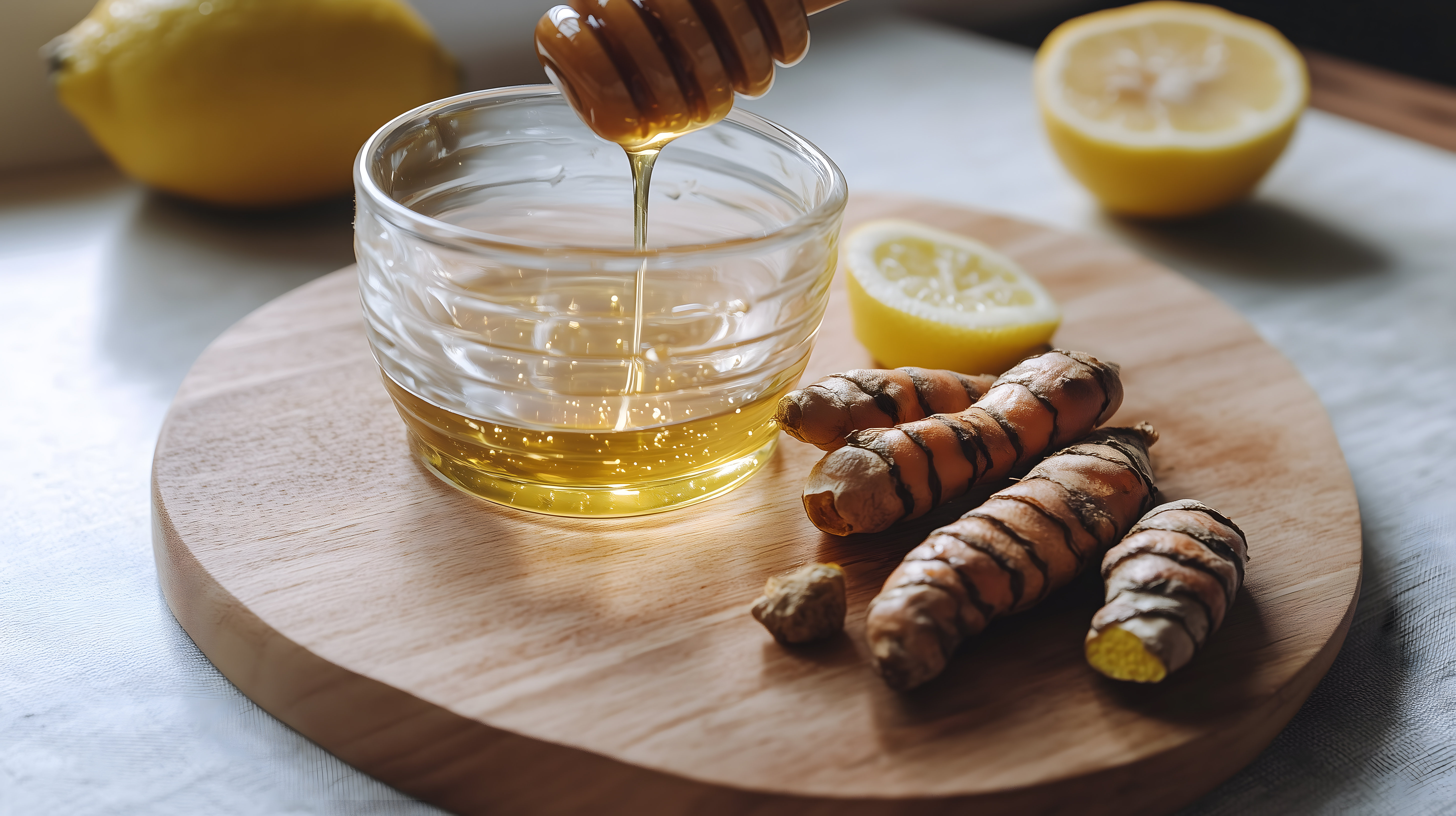 Das Bild zeigt eine Nahaufnahme von Honig, der von einem Holzlöffel tropft und sich über frische Kurkuma-Wurzeln und Zitronenscheiben ergießt. Die Komposition ist stimmungsvoll und reduziert, mit warmen Gelbtönen, die eine natürliche, gesunde Atmosphäre vermitteln. Das Foto eignet sich perfekt für Rezepte, Blogbeiträge oder Social-Media-Inhalte rund um Themen wie Naturheilkunde, Detox, Superfood und gesunde Ernährung. Als hochwertiges, kostenloses Stockfoto unter der Creative-Commons-Lizenz kann es vielfältig in verschiedenen Kontexten eingesetzt werden.
