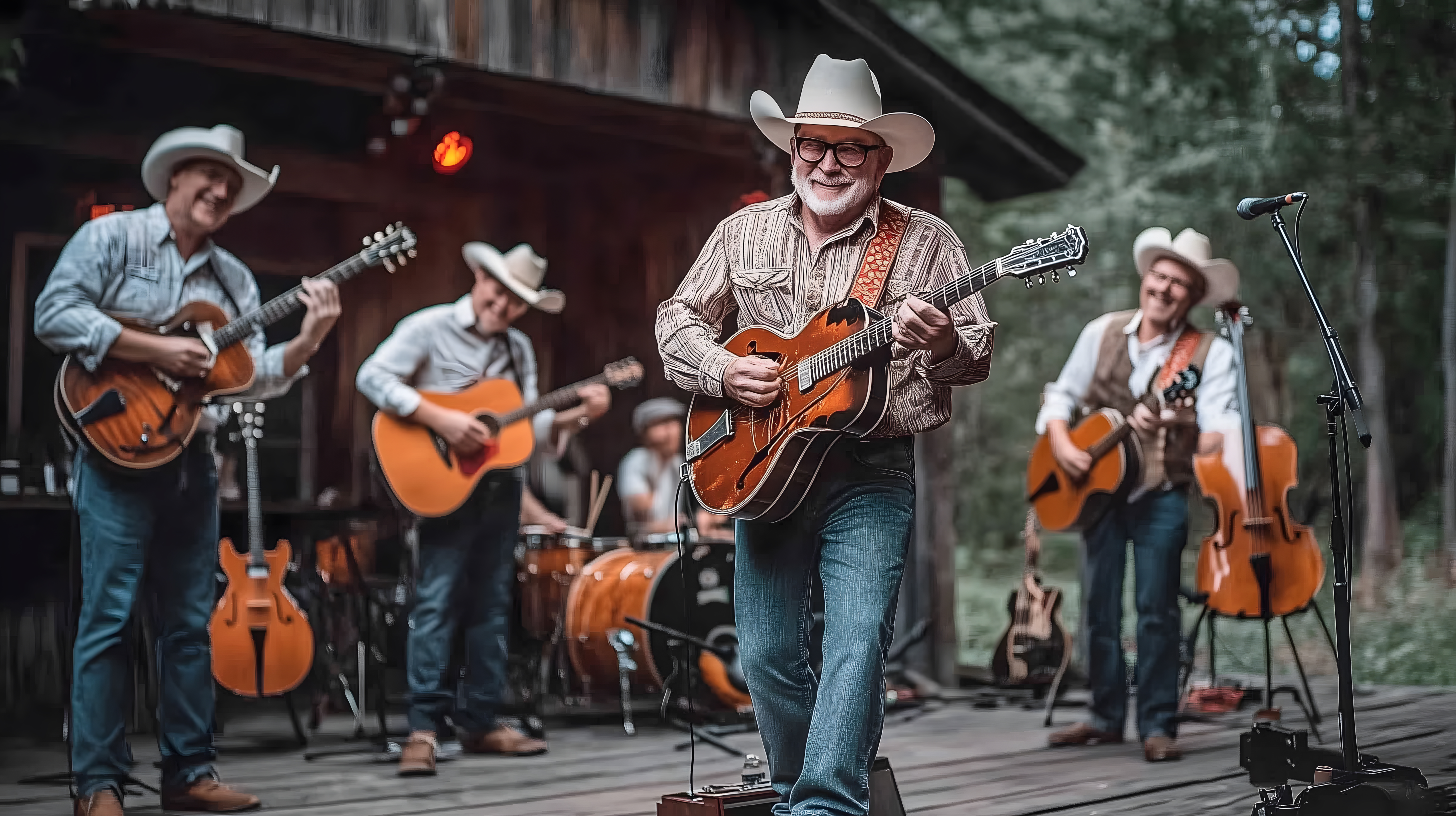 Dieses eindrucksvolle Foto zeigt eine lebendige Countryband, die auf einer Outdoor-Bühne in einer ländlichen Umgebung auftritt. Die Musiker, gekleidet in Cowboyhüte und Jeans, spielen fröhlich ihre Gitarren und Instrumente, während sie vom Publikum umringt sind. Die hölzerne Bühnenkonstruktion, umgeben von Bäumen und einer malerischen Landschaft, verleiht der Szene einen authentischen Country-Charakter. Dieses stimmungsvolle Stockfoto eignet sich hervorragend für den Einsatz in Blogbeiträgen, Newslettern oder Social-Media-Kampagnen rund um das Thema Countrymusik, Festivals oder ländliche Veranstaltungen. Es ist in hoher Auflösung und unter einer Creative-Commons-Lizenz verfügbar.