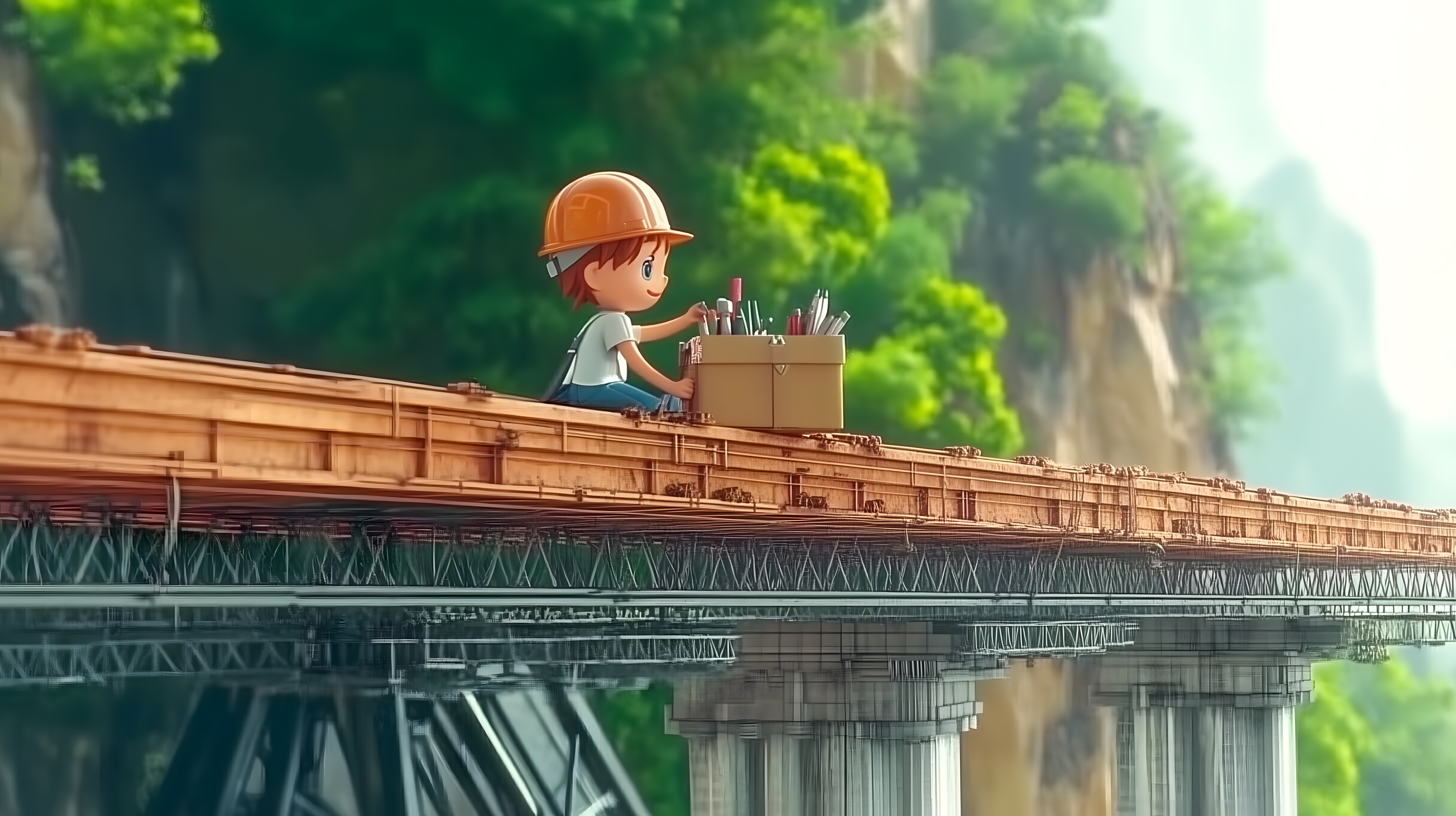 Das Bild zeigt einen Cartoon-Arbeiter, der auf einer Holzbrücke inmitten eines grünen Waldes steht und eine Kiste mit Werkzeugen begutachtet. Die Szene vermittelt den Eindruck einer Baustelleninspektion oder -überwachung in einer naturnahen Umgebung. Die detailreiche Illustration im Anime-Stil, die klaren Farben und die friedliche Atmosphäre machen dieses Stockfoto zu einem idealen Bild für den Einsatz in Blogs, Newslettern oder sozialen Medien rund um Themen wie Nachhaltigkeit, Naturschutz oder Infrastrukturprojekte. Als kostenloses, hochauflösendes Bild unter einer Creative-Commons-Lizenz ist es zudem flexibel einsetzbar.
