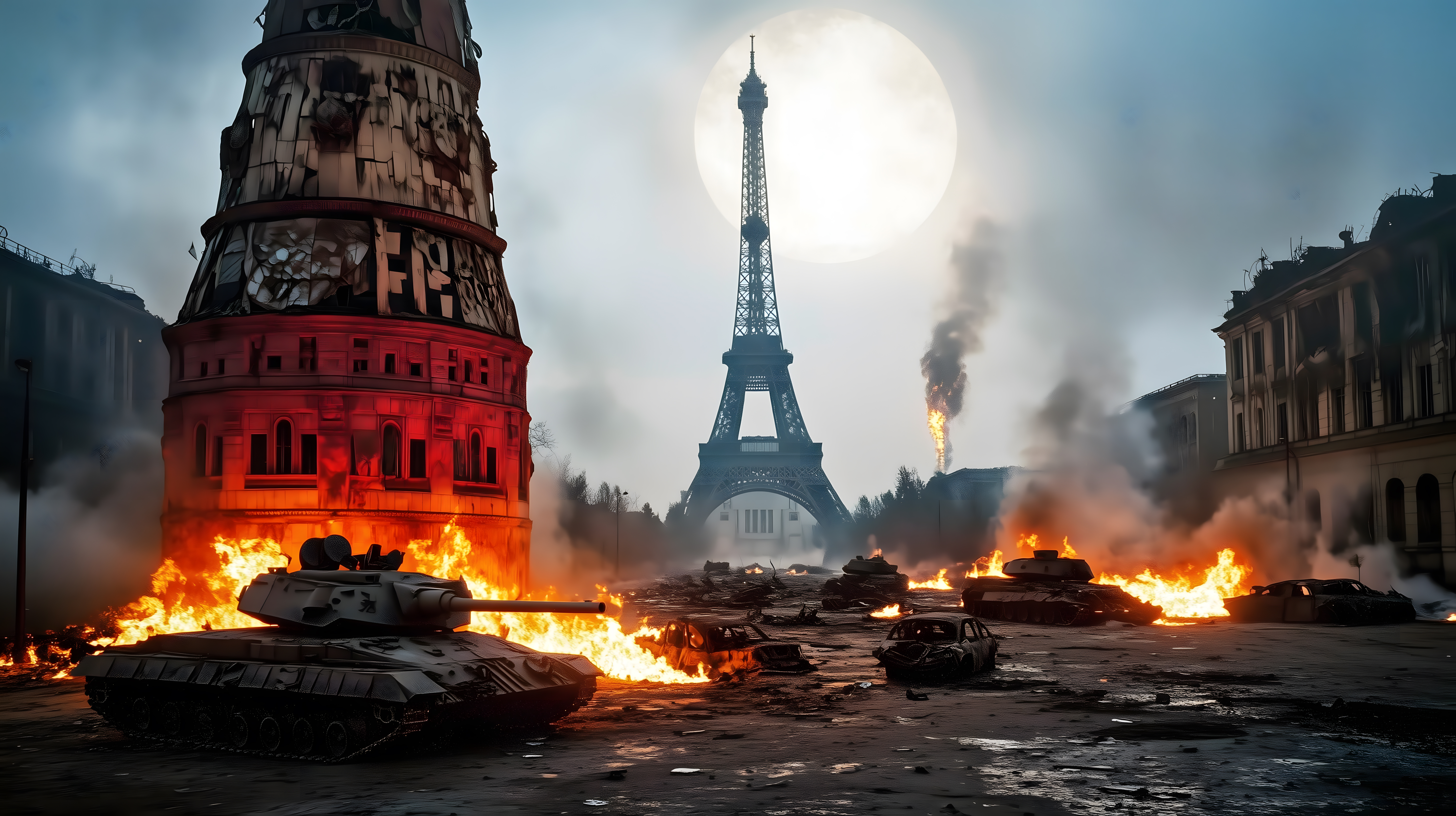 Dieses dramatische Bild zeigt eine Kriegsszene in Paris mit dem Eiffelturm im Hintergrund. In den Vordergrund sind mehrere brennende Panzer und andere Militärfahrzeuge zu sehen, umgeben von Rauch und Flammen. Die Perspektive ist leicht schräg, was der Szene eine noch intensivere, actiongeladene Atmosphäre verleiht. Dieses Foto wäre perfekt für Blogs, Newsletter oder Social-Media-Beiträge zum Thema Krieg, Zerstörung oder historische Ereignisse. Als kostenloses Stockfoto in hoher Auflösung und unter Creative-Commons-Lizenz ist es vielseitig einsetzbar.
