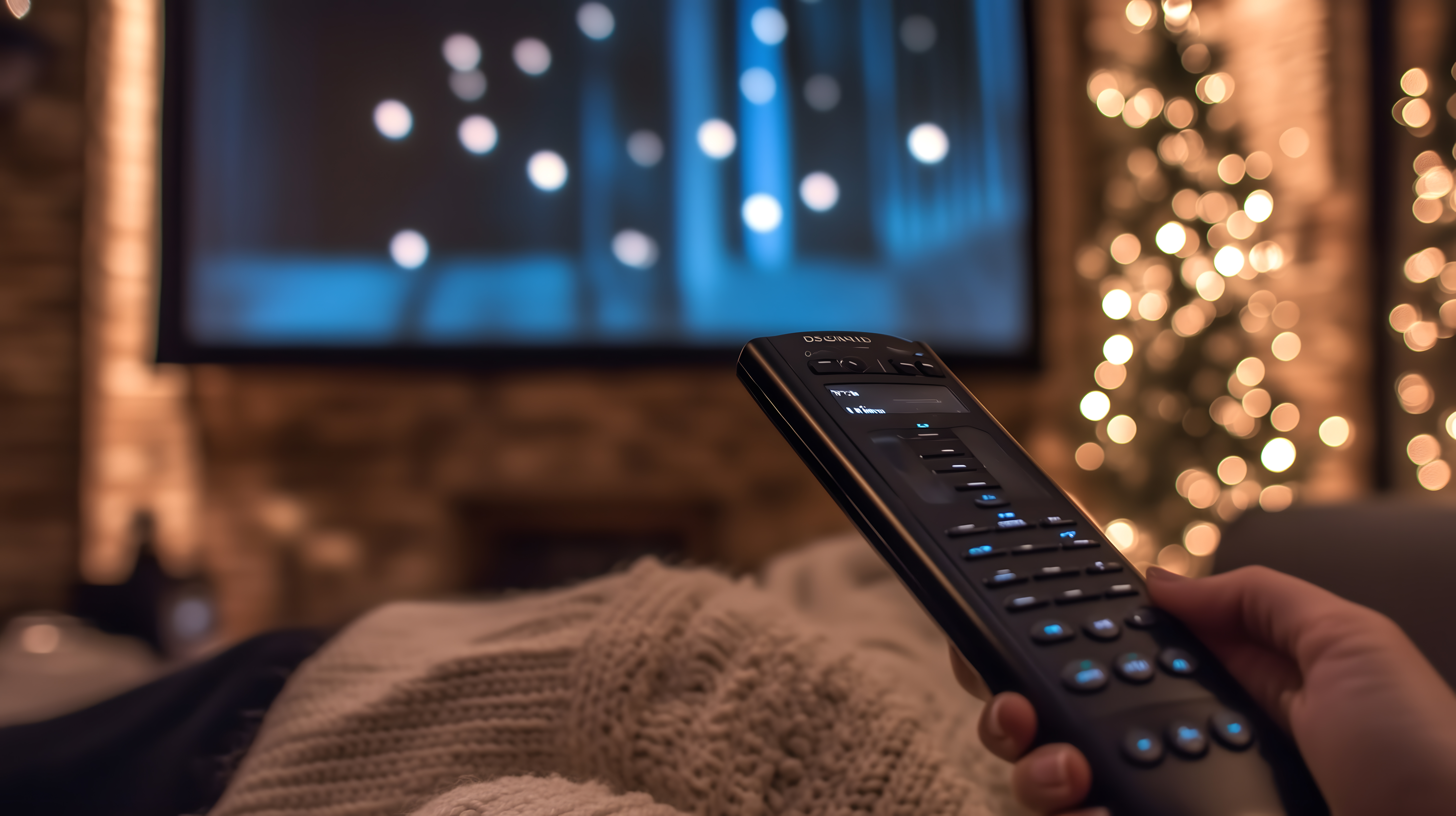 Das Bild zeigt eine Person, die es sich auf einem Sofa gemütlich gemacht hat und eine Fernbedienung in der Hand hält. Im Hintergrund ist ein Fernseher zu sehen, der ein bläulich-weißes Licht ausstrahlt. Die Umgebung ist mit warmen, goldenen Lichterketten dekoriert, was eine einladende und entspannte Atmosphäre schafft. Das Foto vermittelt den Eindruck eines gemütlichen Fernsehabends zu Hause in gemütlicher Umgebung.