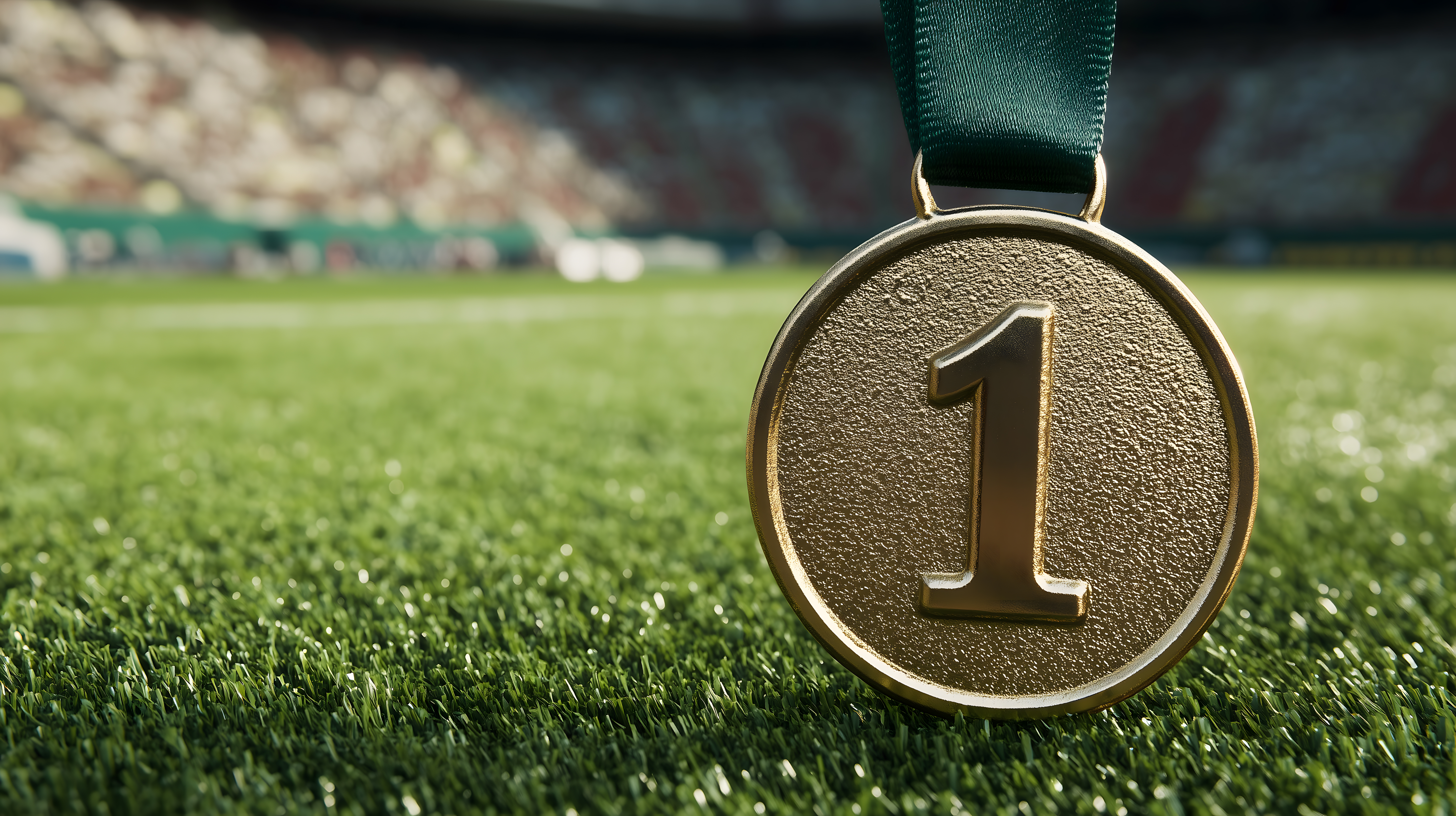 Dieses Stockfoto zeigt eine goldene Medaille mit der Nummer Eins, die vor einem grünen Rasen in einem Sportstadion aufgenommen wurde. Die Medaille hängt an einem grünen Band und ist in einer Nahaufnahme zu sehen, wodurch der metallische Glanz und die detailreiche Oberfläche gut zu erkennen sind. Der Hintergrund ist unscharf, wodurch der Fokus ganz auf der Medaille liegt. Dieses Bild eignet sich hervorragend für Blogbeiträge, Newsletter oder Werbeanzeigen rund um Themen wie Leistung, Erfolg, Wettbewerb oder Sport. Als kostenloses Stockfoto in hoher Auflösung und unter der Creative-Commons-Lizenz lässt es sich vielseitig einsetzen.