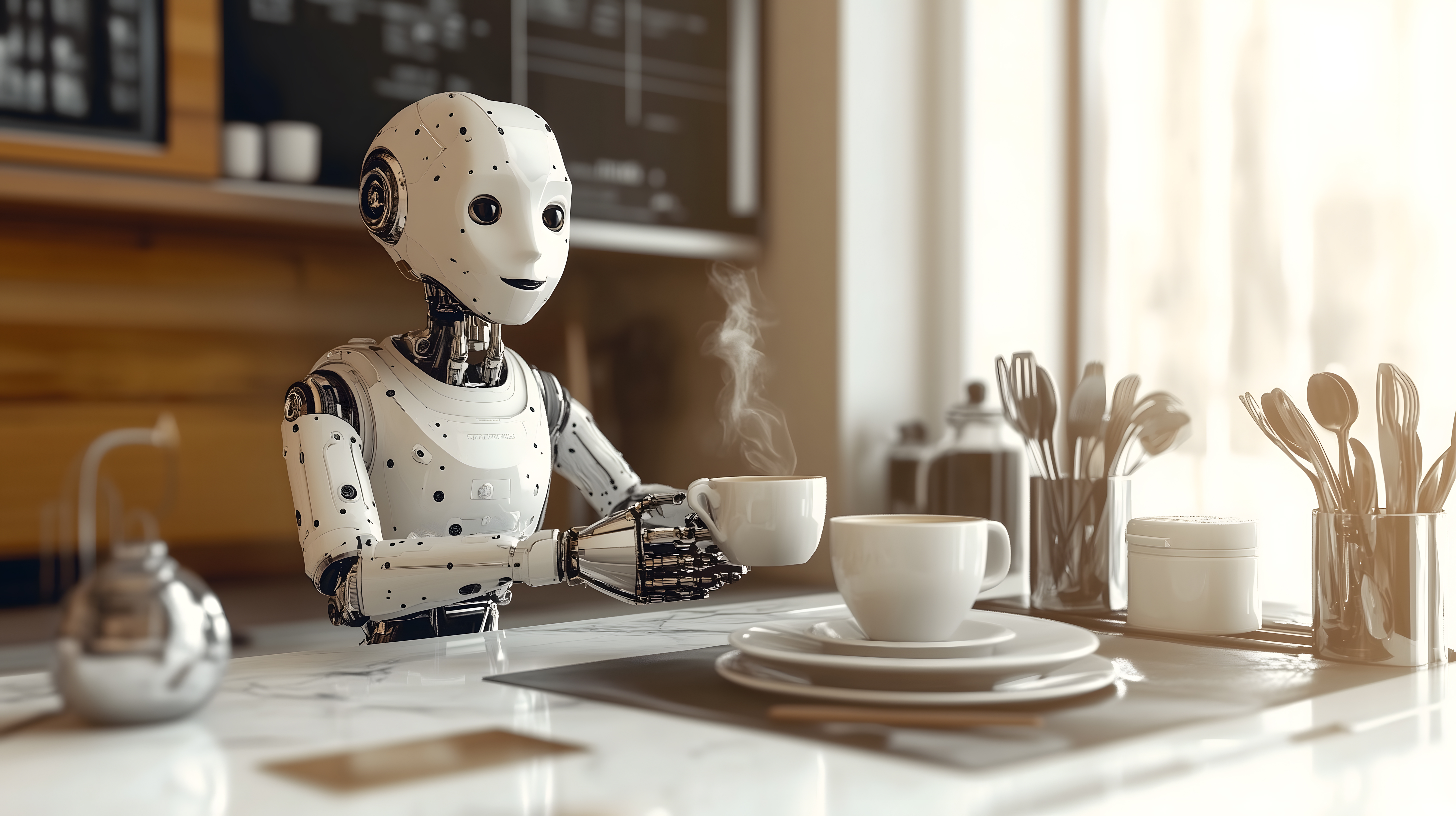 Dieses Stockfoto zeigt einen humanoiden Roboter, der in einer modernen Küche Kaffee zubereitet. Der Roboter steht an einem hellen Holztisch und hält eine Tasse in seiner mechanischen Hand. Auf dem Tisch sind weitere Tassen, Teller und Besteck zu sehen, was die Küchenatmosphäre unterstreicht. Das Bild strahlt eine futuristische und technologische Stimmung aus, die Möglichkeiten der Automatisierung im Haushalt andeutet. Dieses hochauflösende Stockfoto eignet sich hervorragend für den Einsatz in Blogs, Newslettern, Social-Media-Posts oder Werbematerialien, die sich mit Technologie, Innovation oder der Zukunft des Haushalts beschäftigen. Es steht unter einer Creative-Commons-Lizenz zur kostenlosen Verwendung zur Verfügung.